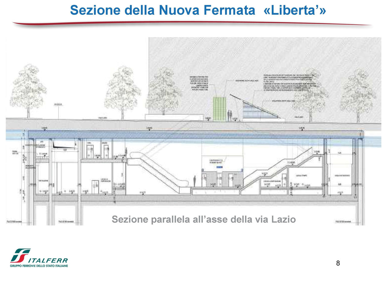 Sarà situata lungo viale Lazio e verrà realizzata al di sotto della sede stradale in galleria artificiale; si articolerà inoltre su tre livelli: piano campagna, piano mezzanino, piano banchina. Dal marciapiede lungo viale Lazio (civ.13) sono previste una scala di accesso, una scala mobile e un ascensore. L’accesso pedonale alle scale fisse sarà coperto da una pensilina.