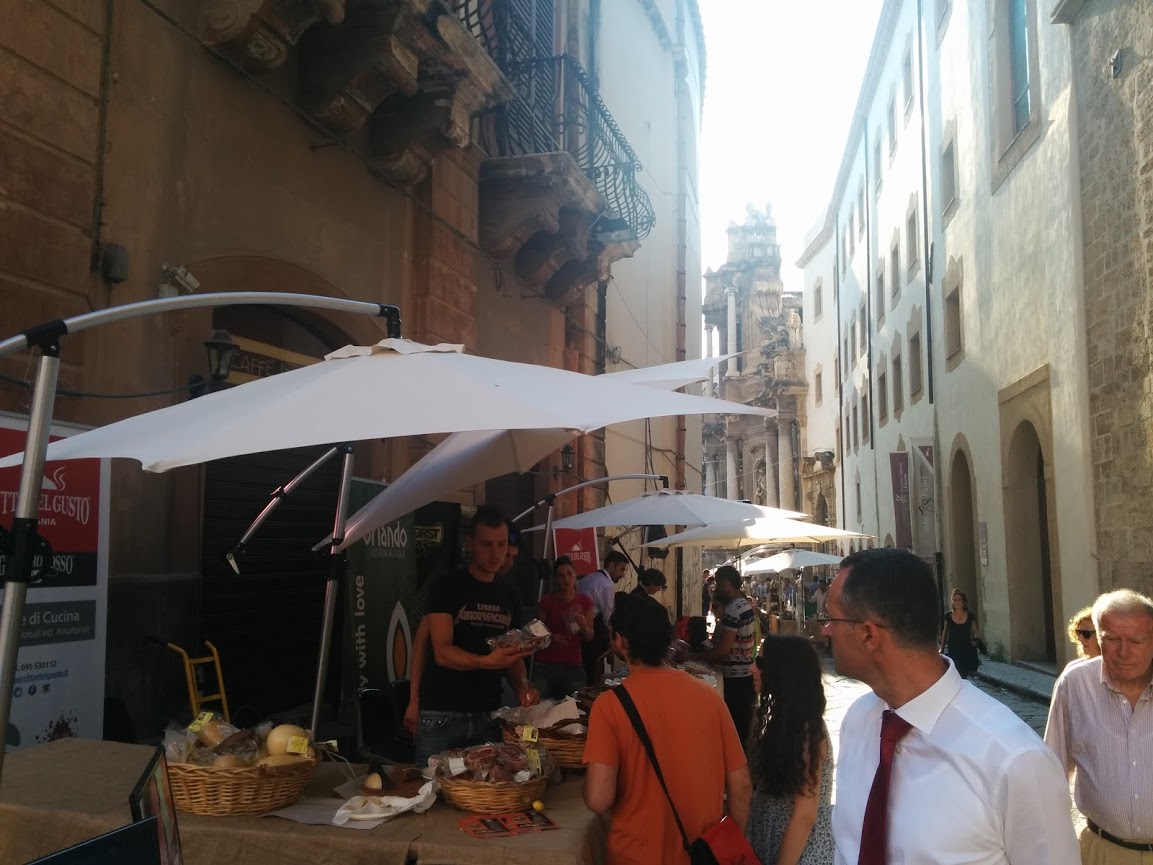 Ma quindi tutte queste persone hanno capito che lì non si arriva in auto e hanno parcheggiato altrove, più distante? Mmmm… devo crederci? Fatto sta che nella piazza c’è “un sacco di gente” che entra ed esce dalla GAM e dai tendoni degli espositori. Senza nemmeno volerlo, mi accorgo di una voce conoscente. Era quel gran personaggio di Gaetano Basile, che sotto una pagoda e con un microfono in mano spiegava per l’ennesima volta quando la vastedda ca mievusa si dice schietta e maritata. Sono rimasto ad ascoltarlo per 20 minuti, interessantissimo. Poi, peccato, è finito.