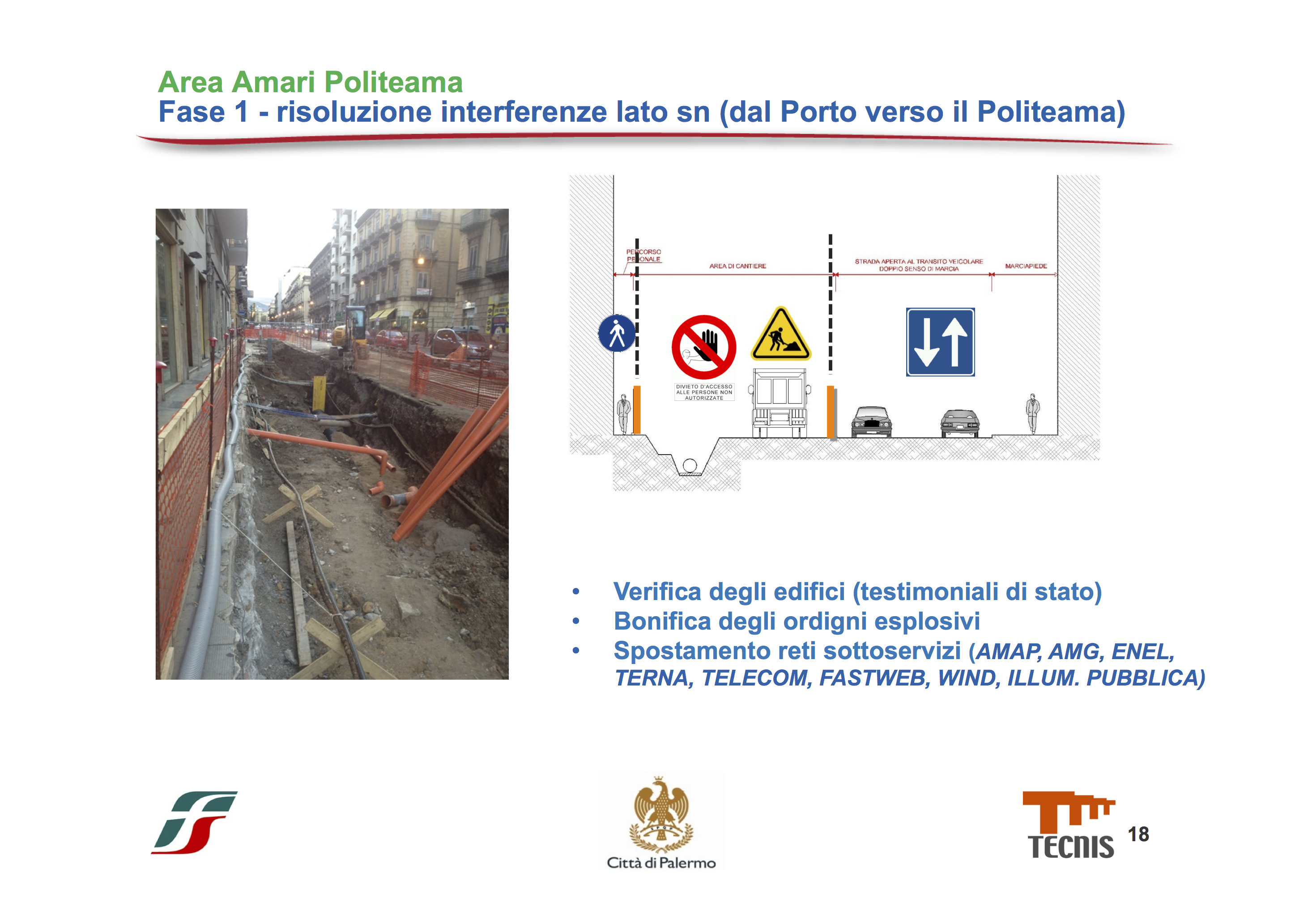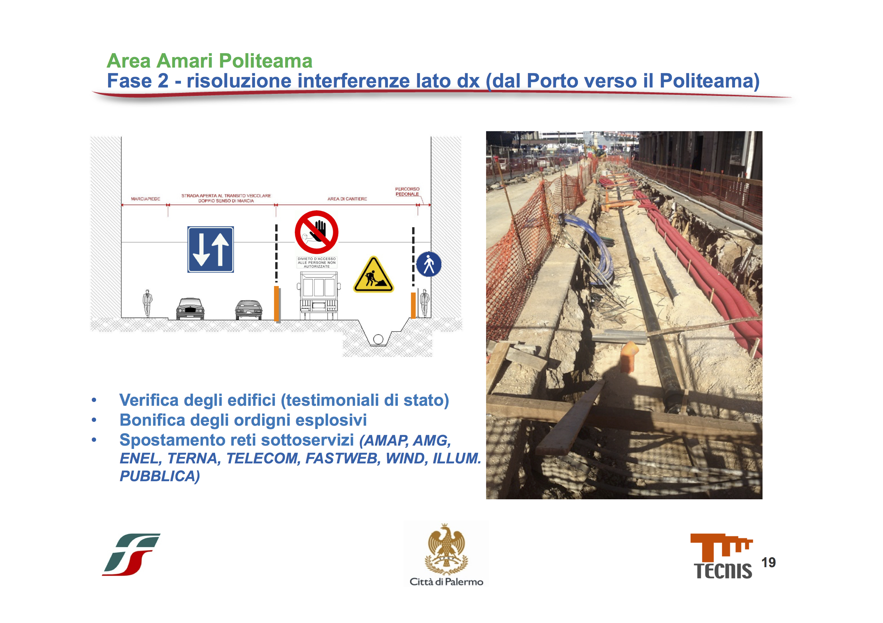 - La prima fase: Nella prima fase verranno spostati tutti i sottoservizi presenti sul lato sinistro (guardando dal porto verso il politeama), quindi i vari cavi Enel, Amap, Amg, ecc e verrà effettuata anche la bonifica degli ordigni esplosivi