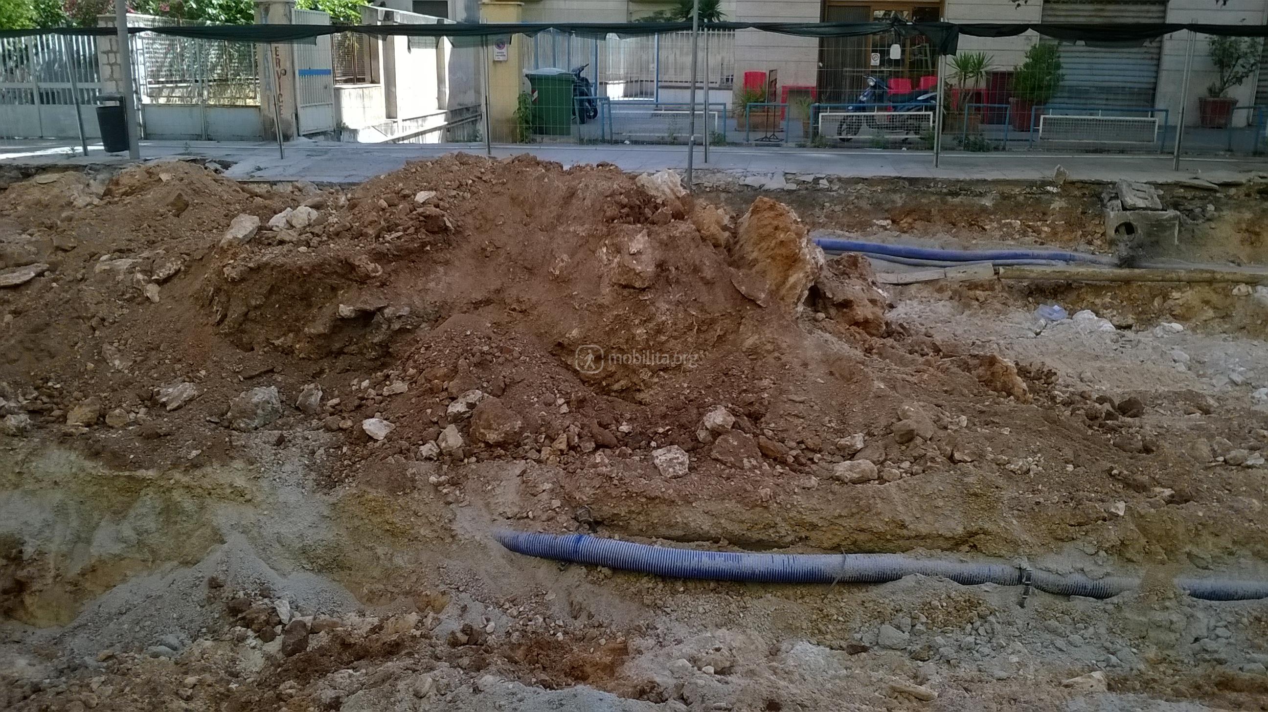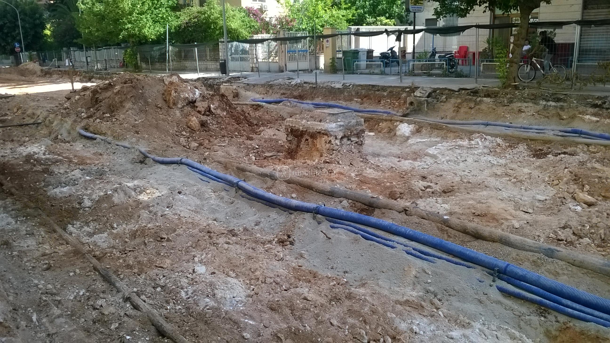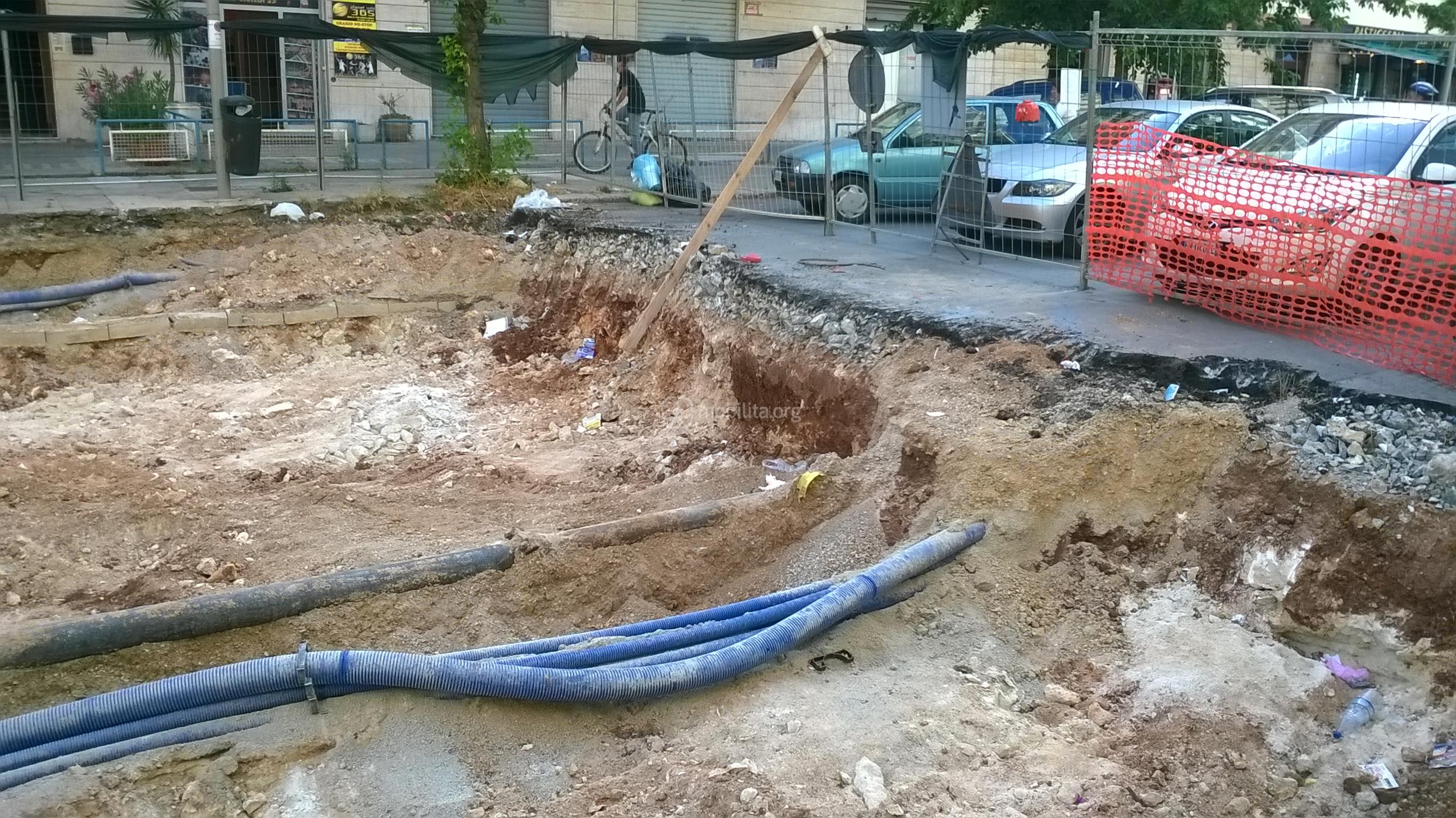 La trincea è larga perché i sottoservizi qui come in via Amari si trovano al centro della strada.