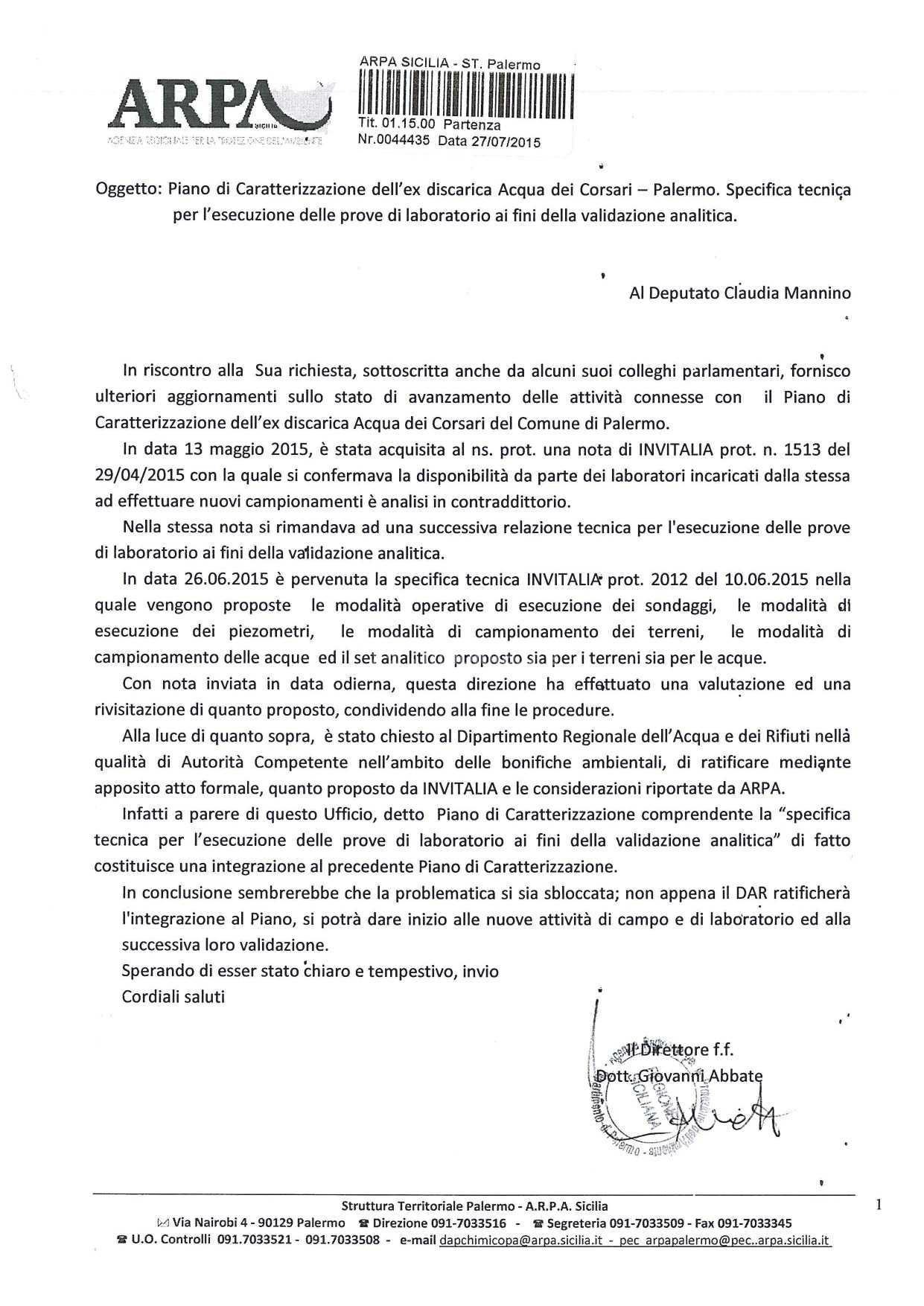 Infine in una lettera inviata dall’Arpa (che alleghiamo) a una parlamentare regionale che aveva chiesto chiarimenti su tale vicenda si fissano ancora altri tempi e incombenze per ripetere atti che già da tempo dovevano essere posti in essere. Tale colpevole ritardo ha di sicuro provocato un danno erariale e un grave nocumento alla possibilità di godimento da parte dei cittadini di un’area disagiata come quella dove sorge il Parco nato sull’ex discarica, e alla città di Palermo tutta.