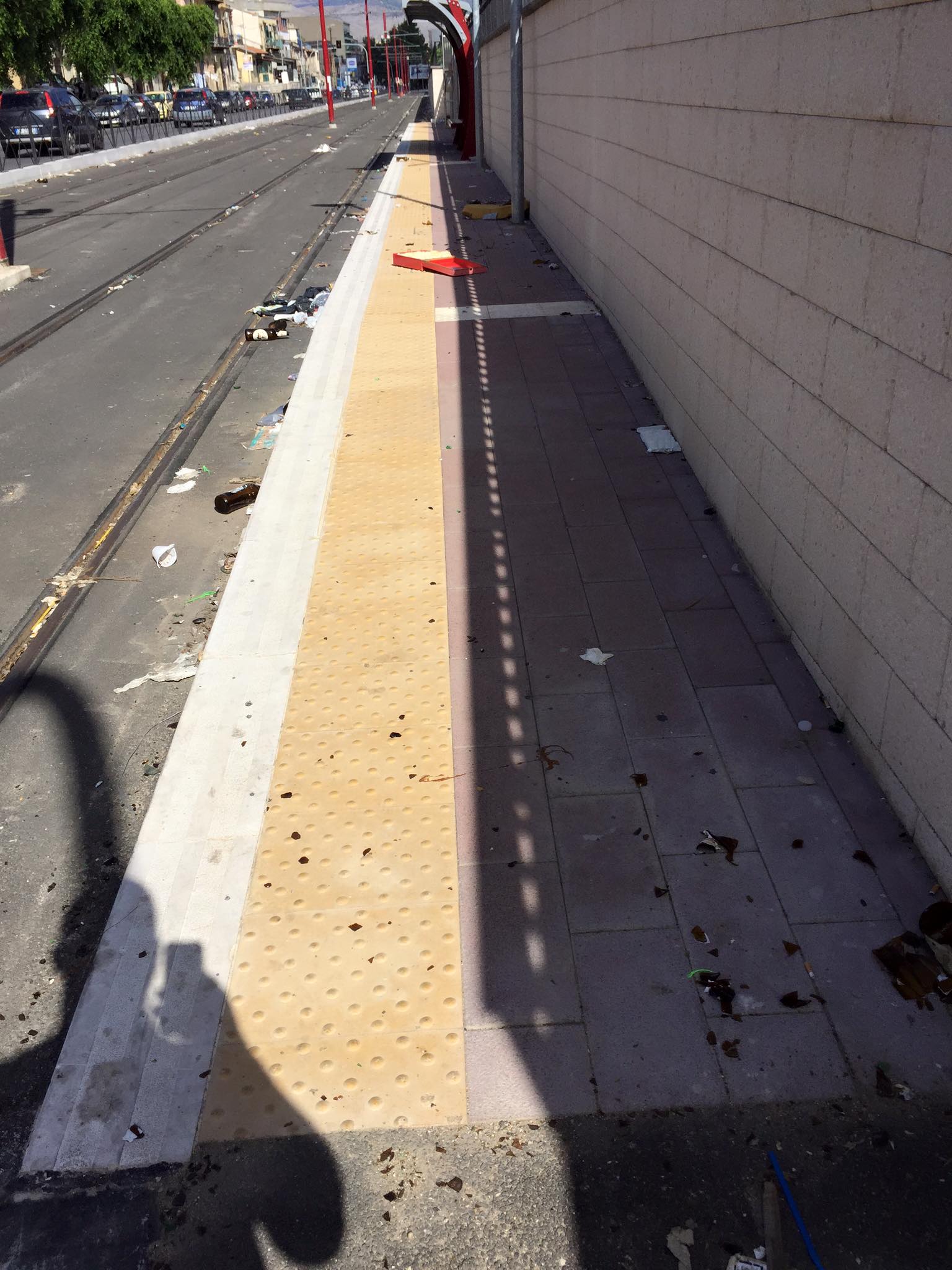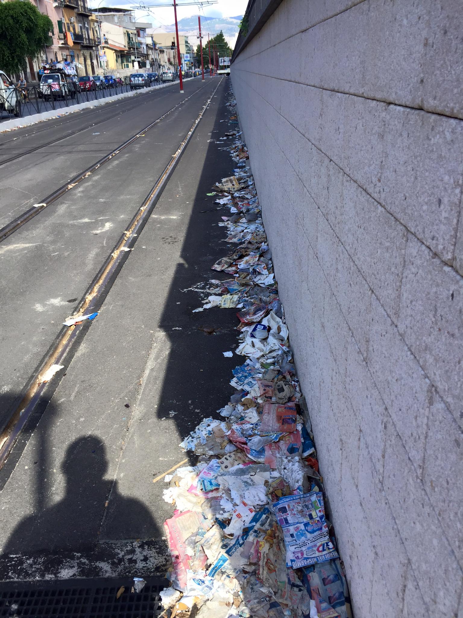 Cartacce ed altri rifiuti che continuano a cumularsi in alcuni tratti della sede tranviaria. Qualcuno dirà che è tutto nella norma, almeno qui a Palermo. Le foto ritraggono un tratto della linea 1 lungo corso dei Mille. A chi spetta la pulizia? Di certo non si tratterà di un lavoro da andare a fare manualmente con scopa e paletta. Questo però è stato fatto, a cura della ditta costruttrice. Ma in futuro, viste le vaste superfici ma soprattutto per una questione di sicurezza saranno necessari altri mezzi. Spazzatrici meccanizzate che periodicamente dovranno passare, prima dell’avvio mattutino dell’esercizio, e pulire la sede tranviaria.