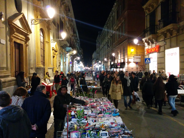 Poi c’è tutto l’asse Ruggero Settimo che è un fiume di teste che si muovono, si fa fatica quasi a camminare, con negozi luminosi, artisti di strada, associazioni di volontariato e l’odore delle caldarroste che si alza quasi fosse la nebbia invernale. Non una macchina, non un clacson.