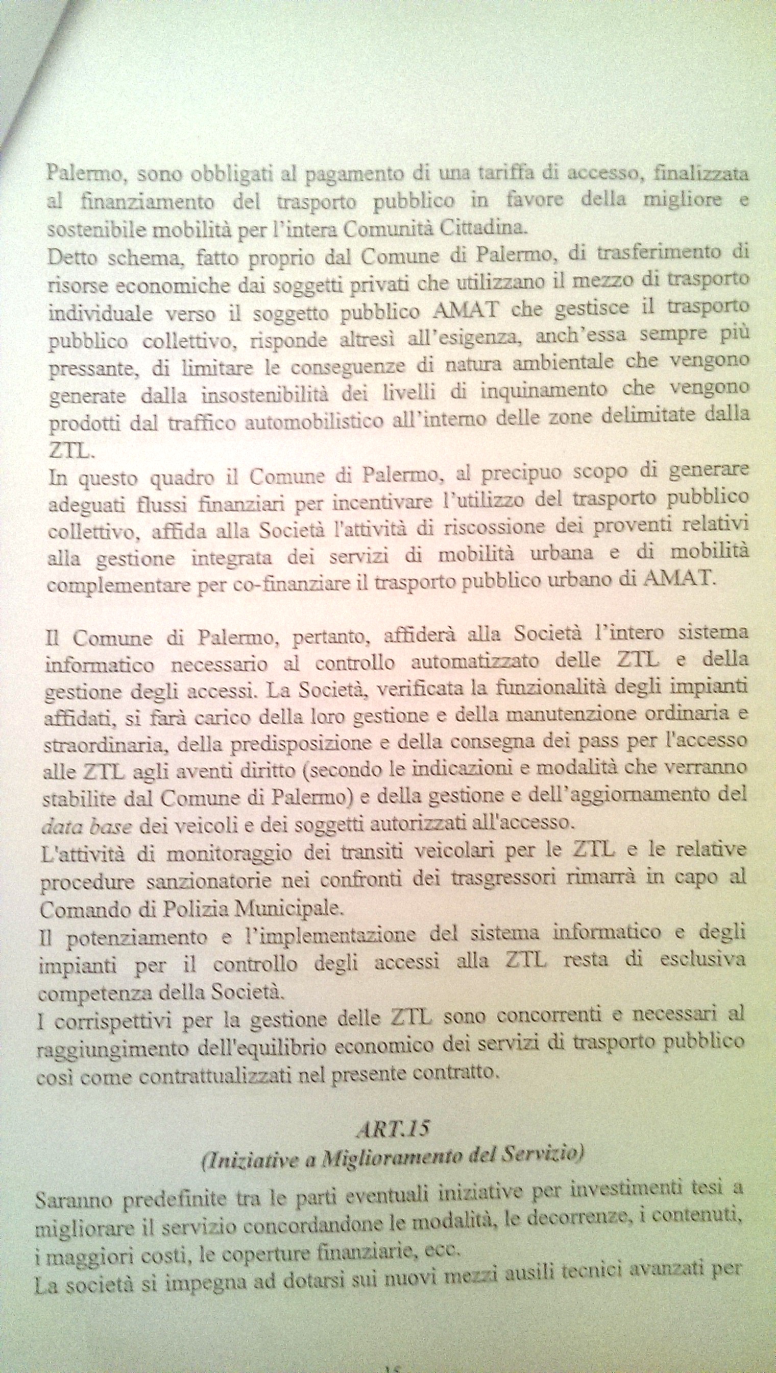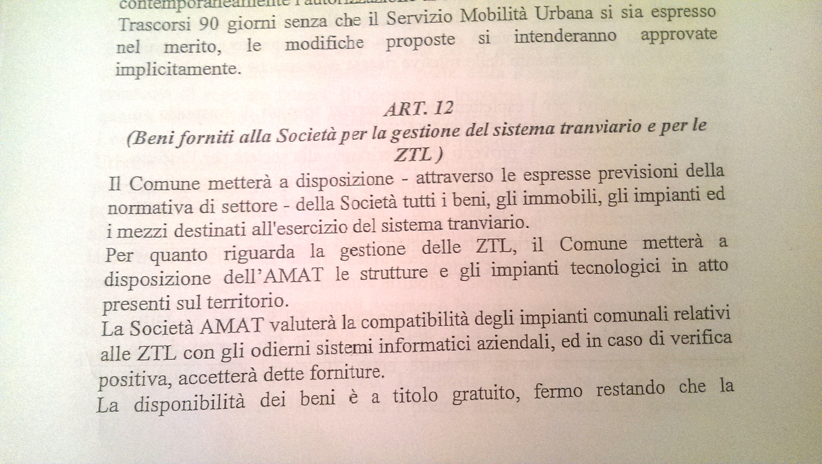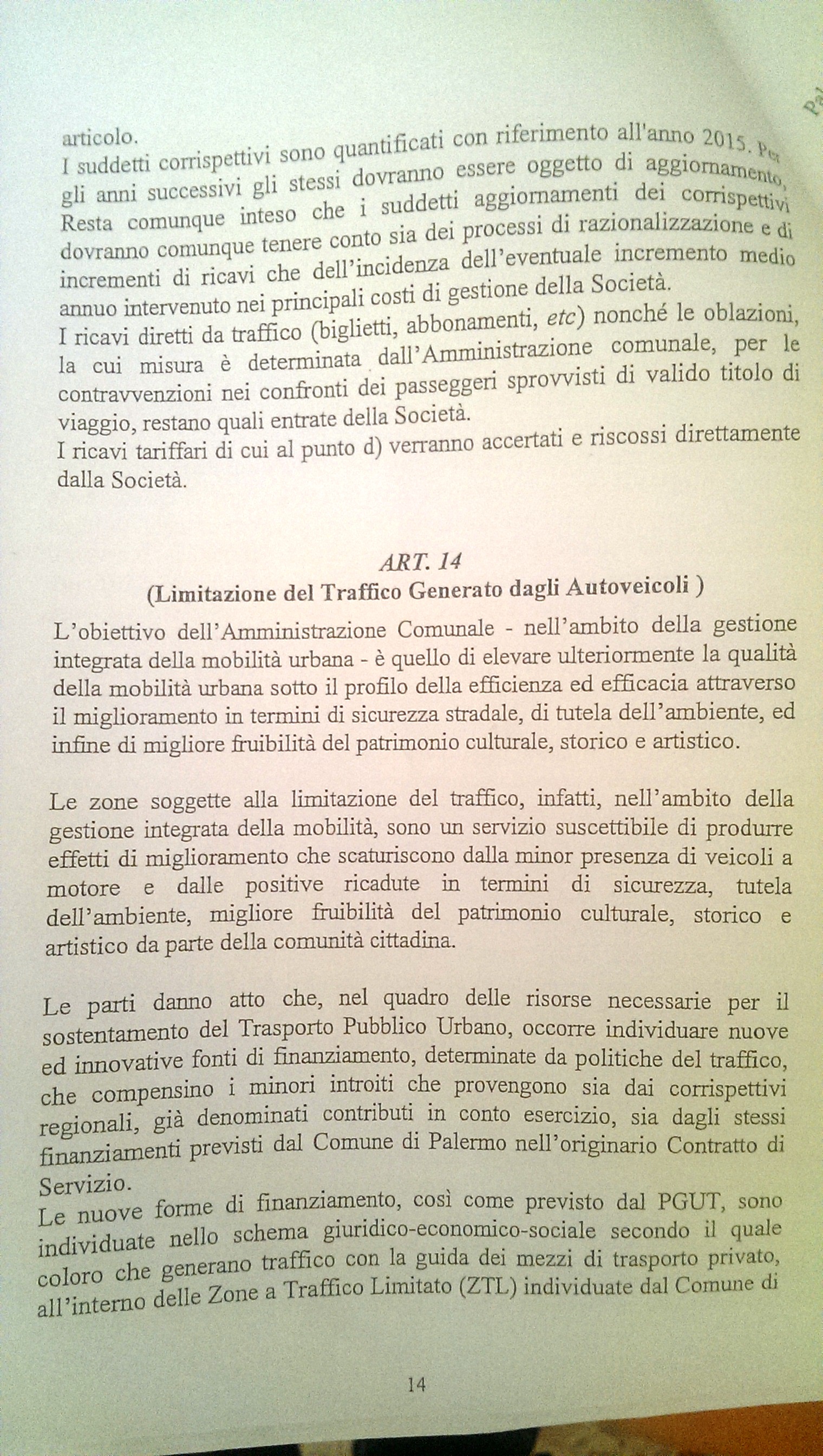 Ma è all’art.14 che vengono spiegate le motivazioni sul perché dell’affidamento della Ztl ad Amat, dove testualmente di parla di “…nuove fonti di finanziamento che compensino i minori introiti che provengono sia dai corrispettivi regionali sia comunali (tagli)….” E’ pertanto errato parlare di Ztl che serve solo ed esclusivamente per la messa in esercizio delle linee tranviarie, bensì a finanziare l’intero servizio di trasporto pubblico oltre che a imporre delle limitazioni al traffico per evitare conseguenze di natura ambientale.