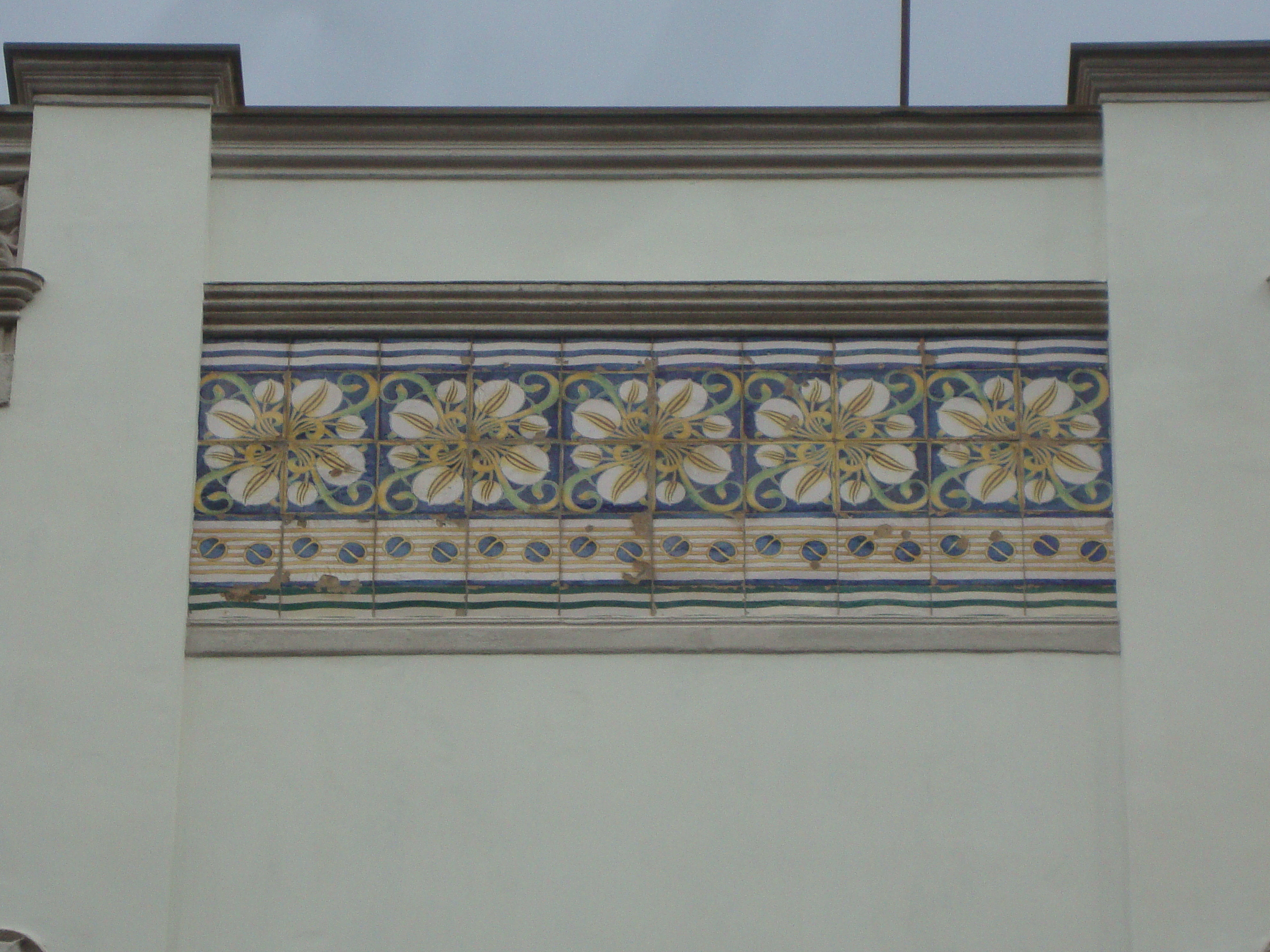 Più accentuate le lesene angolari. Inserti in maiolica dal raffinato disegno completano la parte superiore.