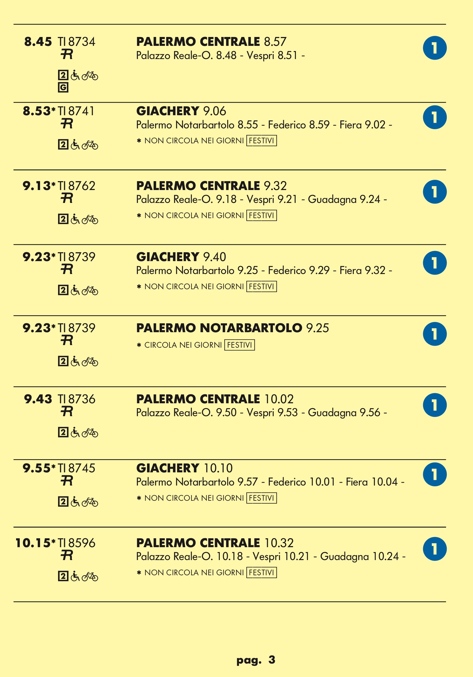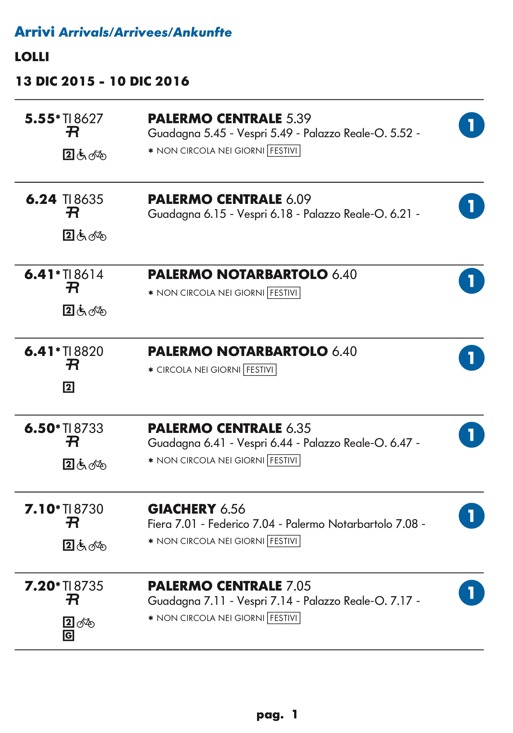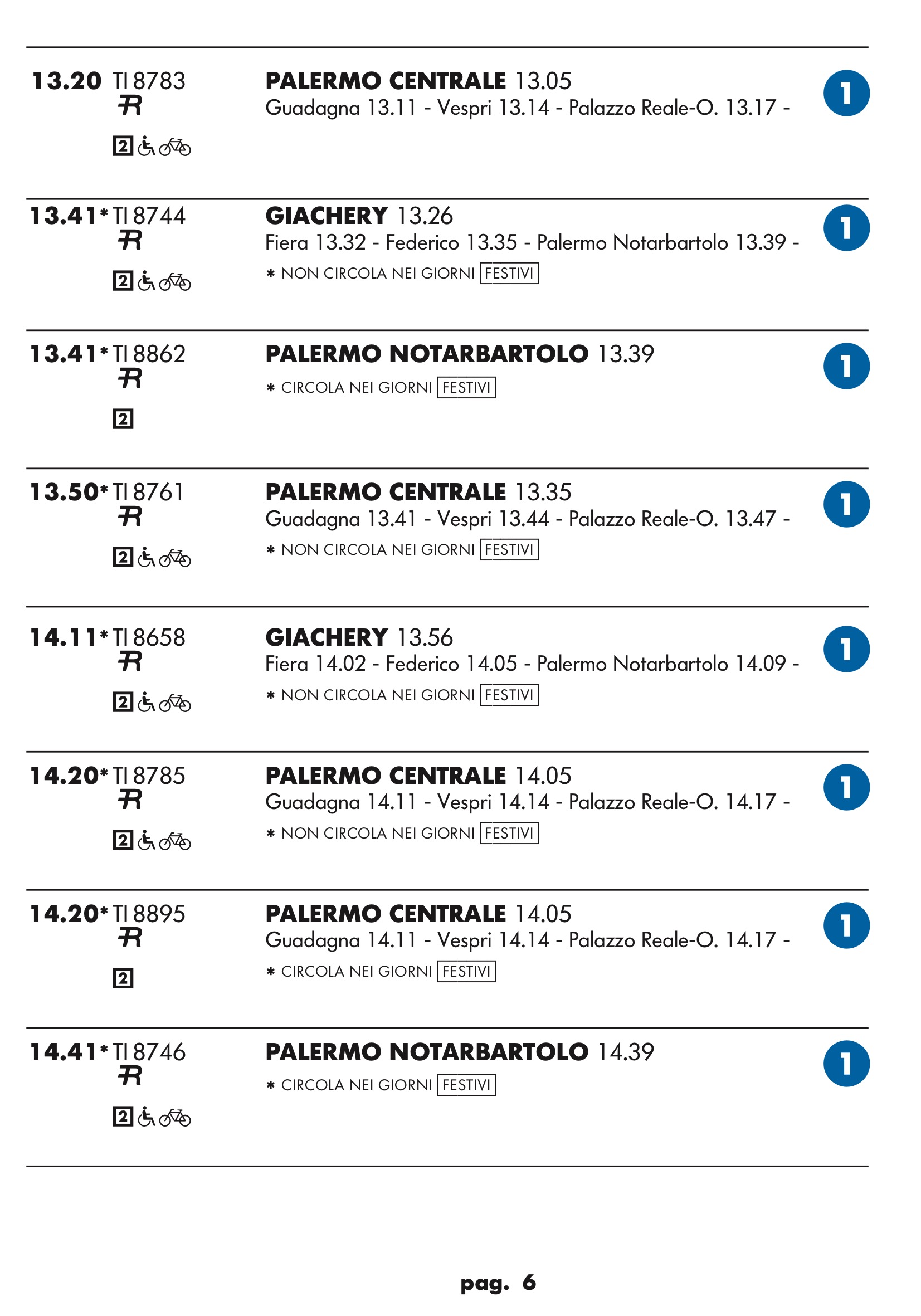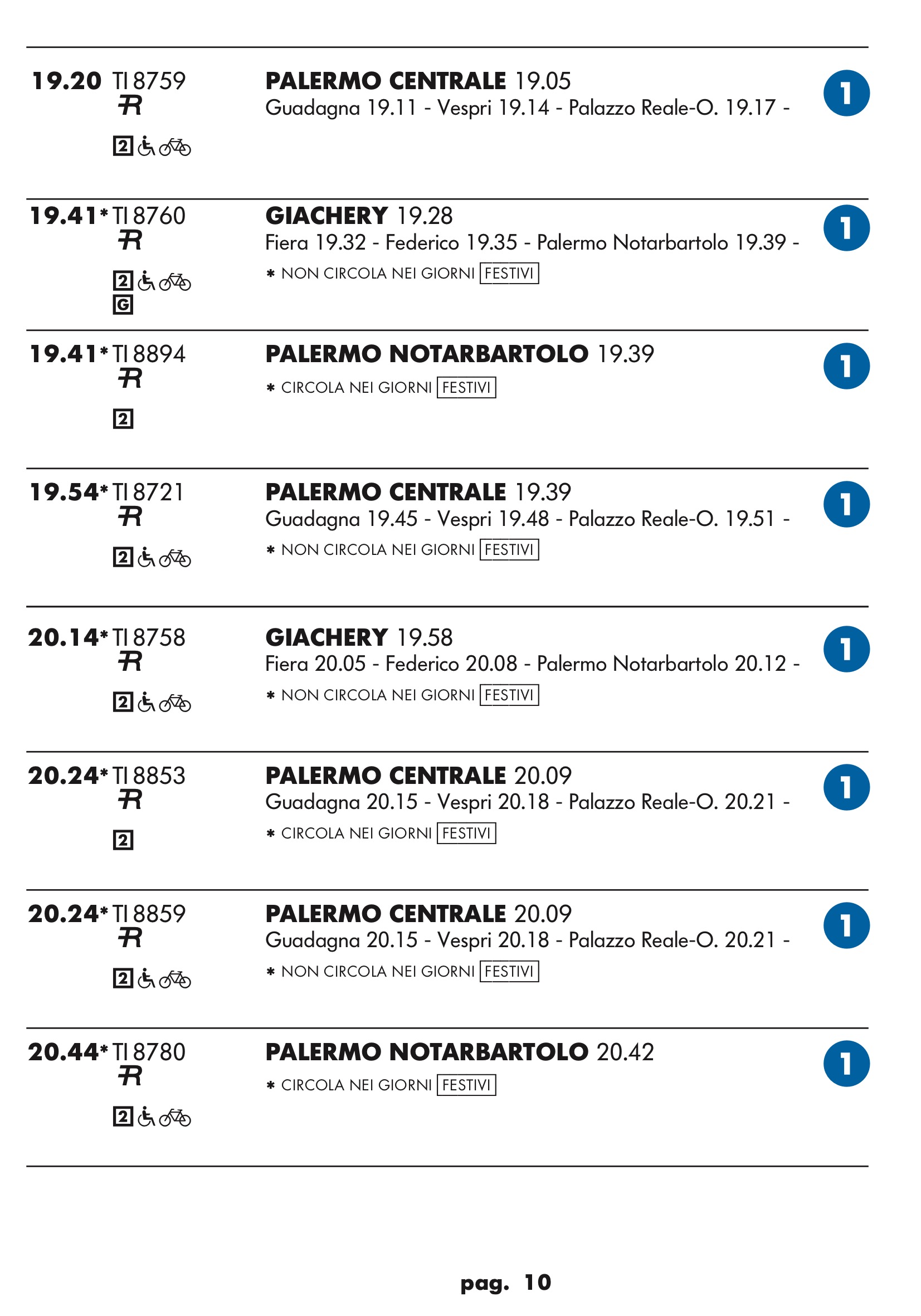 Come temevo in partenza dal binario 1 treno rapido per stazione notarbartolo.Dopo tanta attesa e disagi per i palermitani speravo in qualcosa a metà strada tra un treno ed una metropolitana.Un treno ogni mezz’ora è ridicolo.Vediamo se ora nell’anello dopo aver bloccato mezza città per anni ne faranno passare uno ogni tre quarti d’ora.