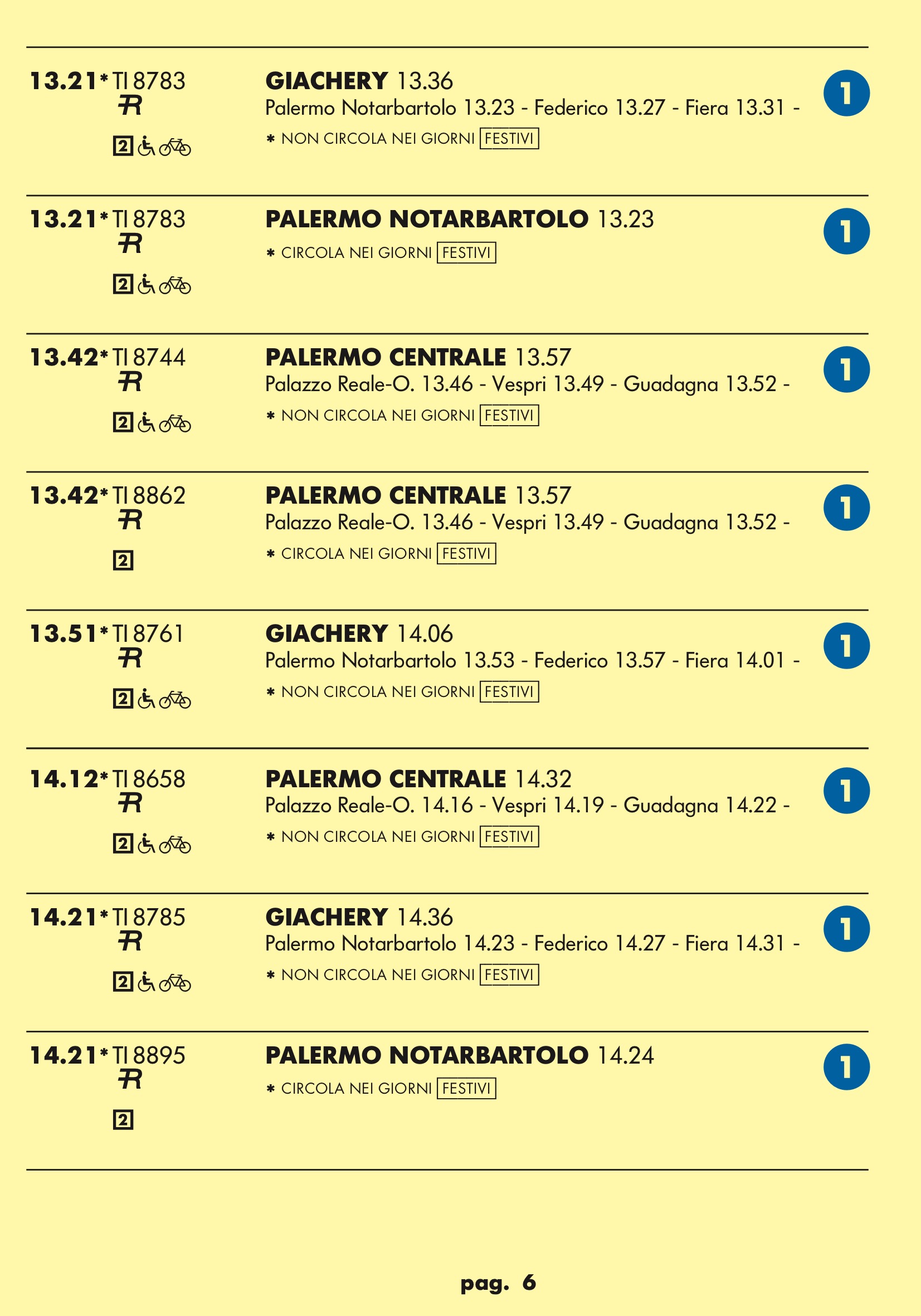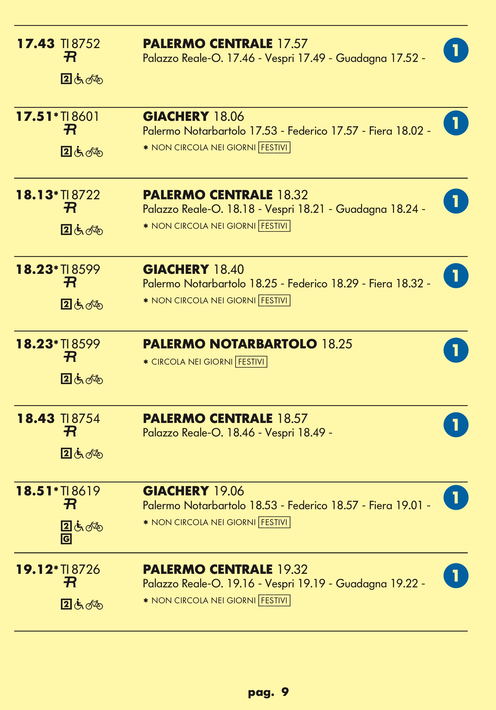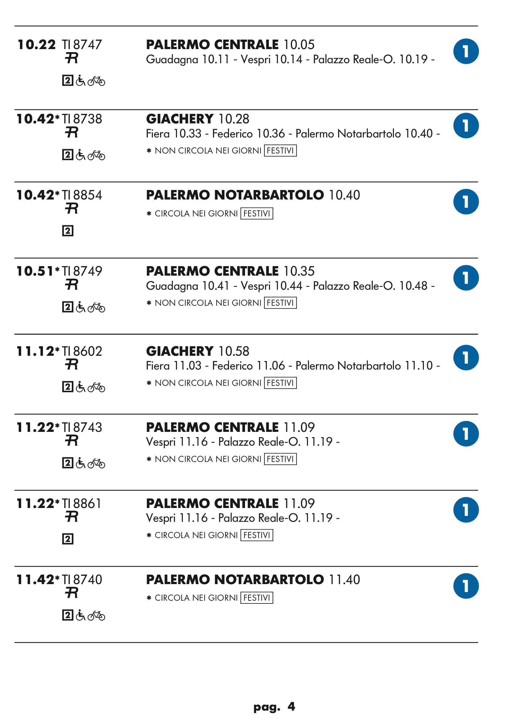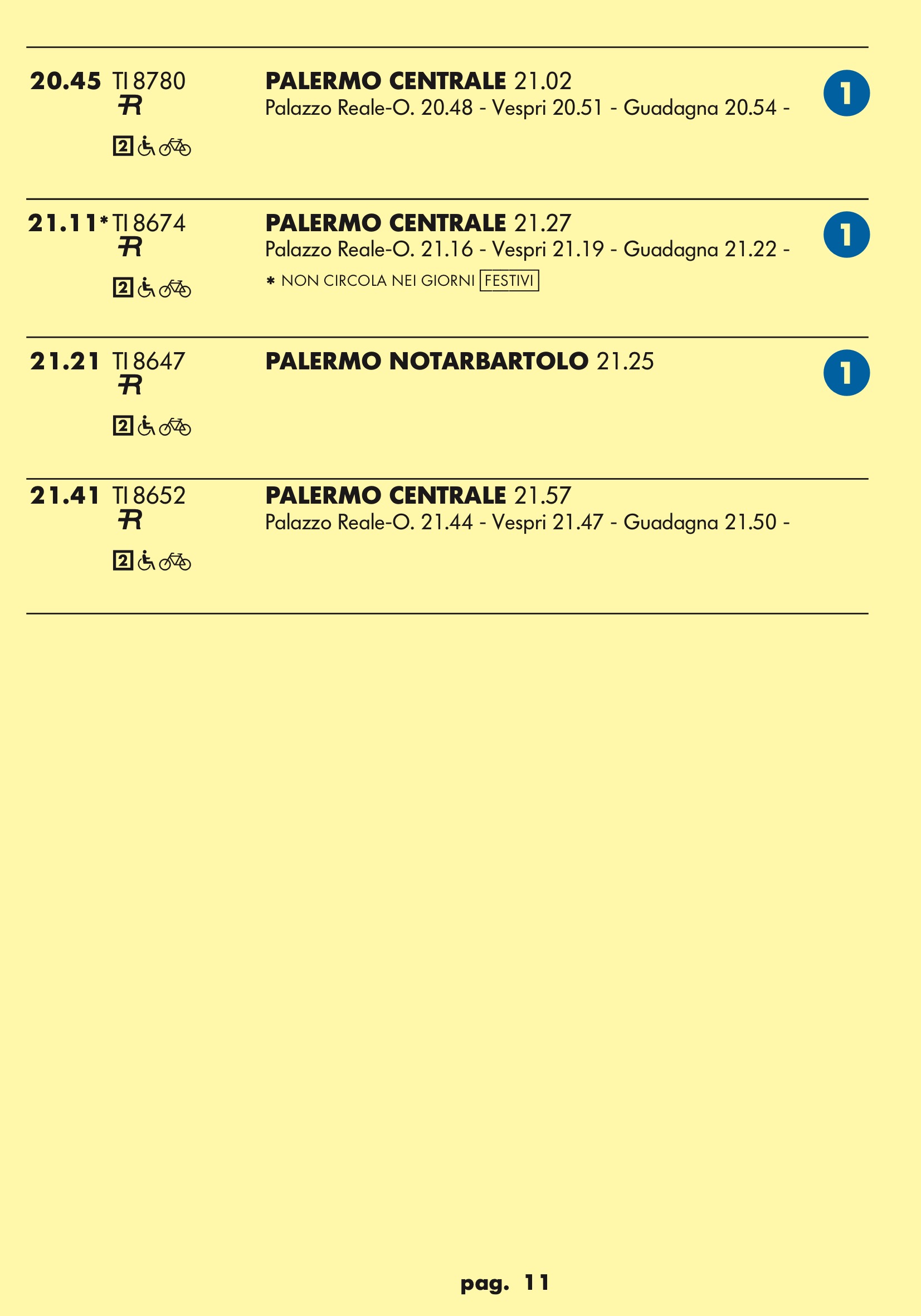 Come temevo in partenza dal binario 1 treno rapido per stazione notarbartolo.Dopo tanta attesa e disagi per i palermitani speravo in qualcosa a metà strada tra un treno ed una metropolitana.Un treno ogni mezz’ora è ridicolo.Vediamo se ora nell’anello dopo aver bloccato mezza città per anni ne faranno passare uno ogni tre quarti d’ora.