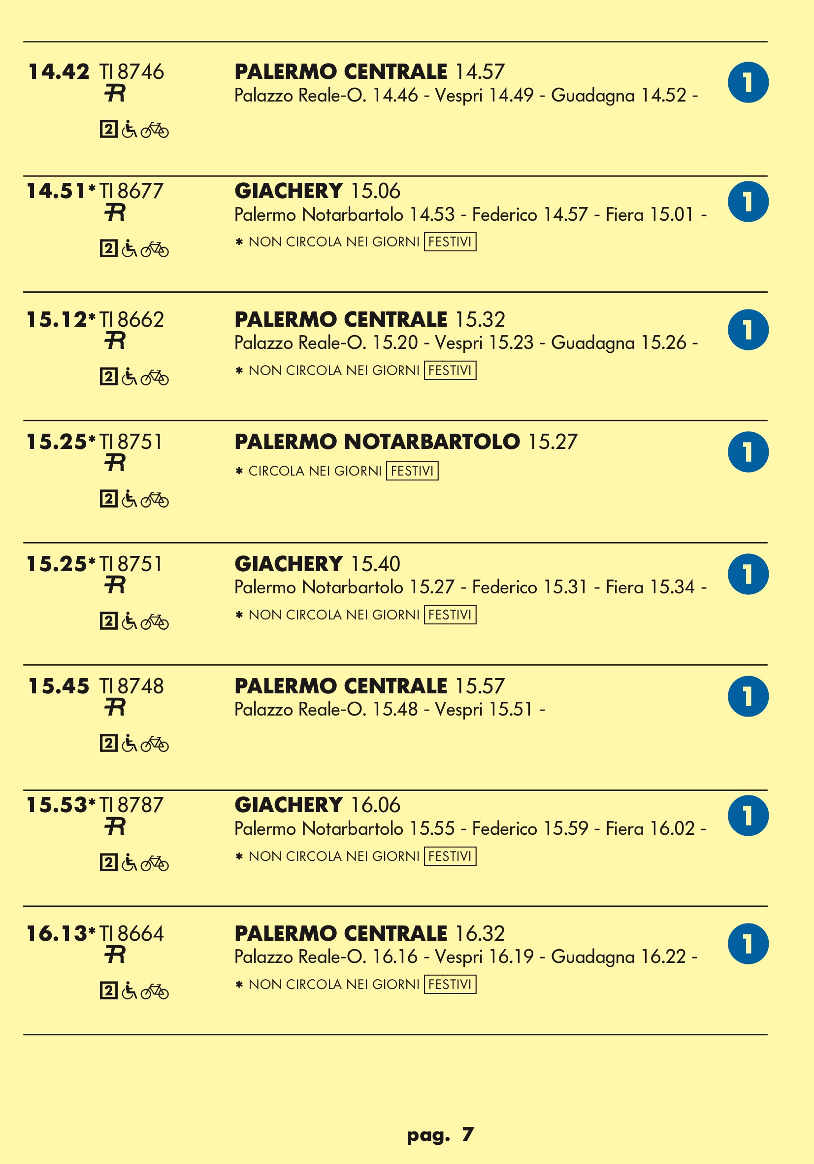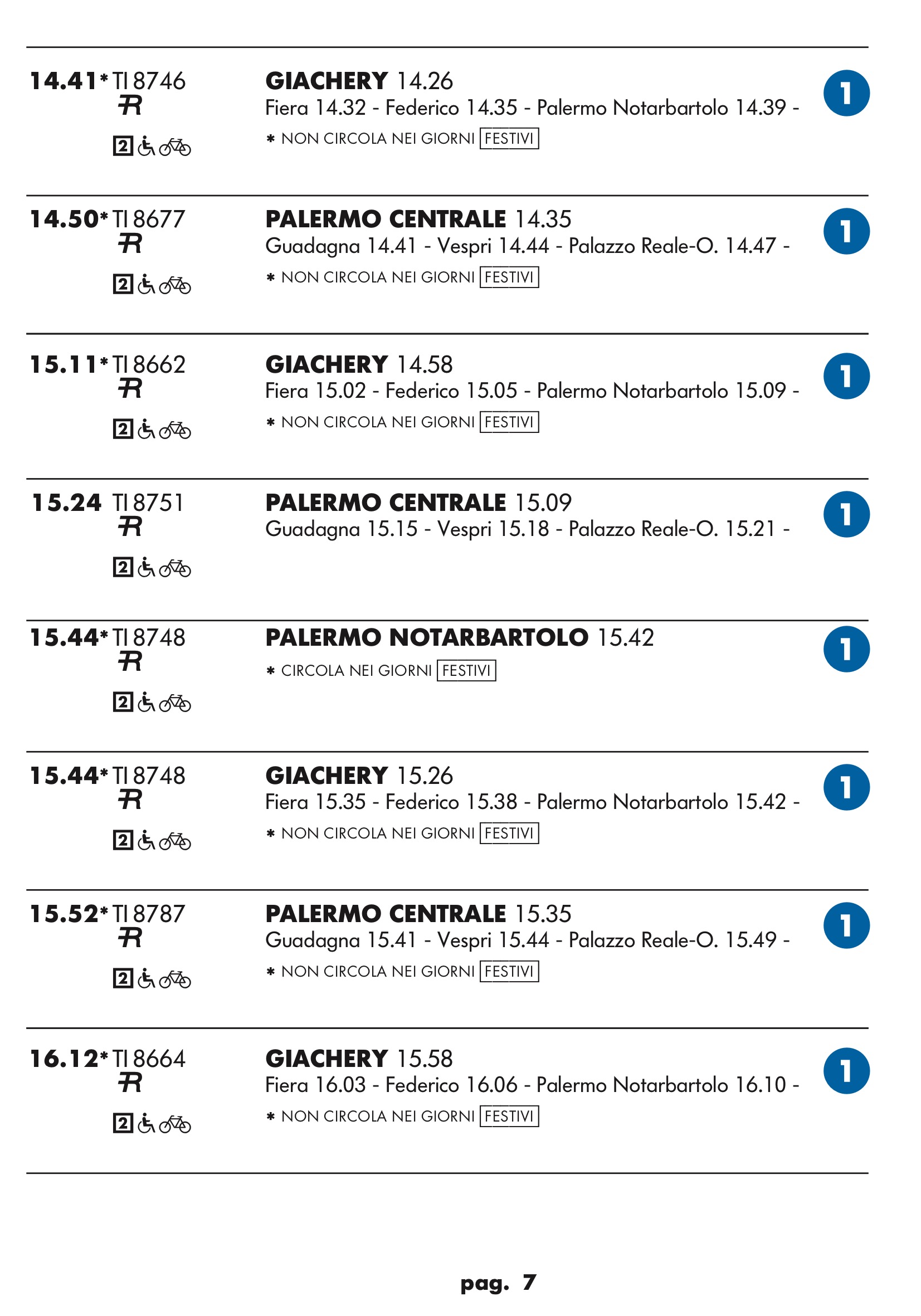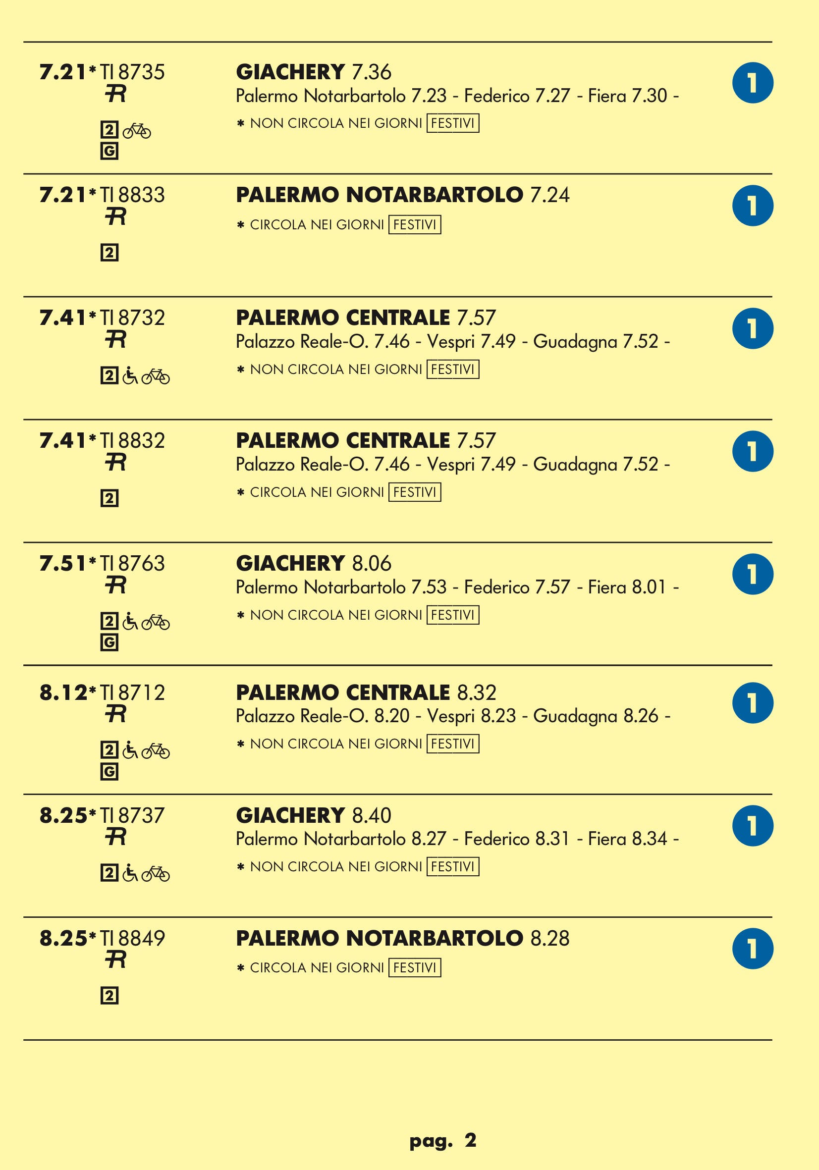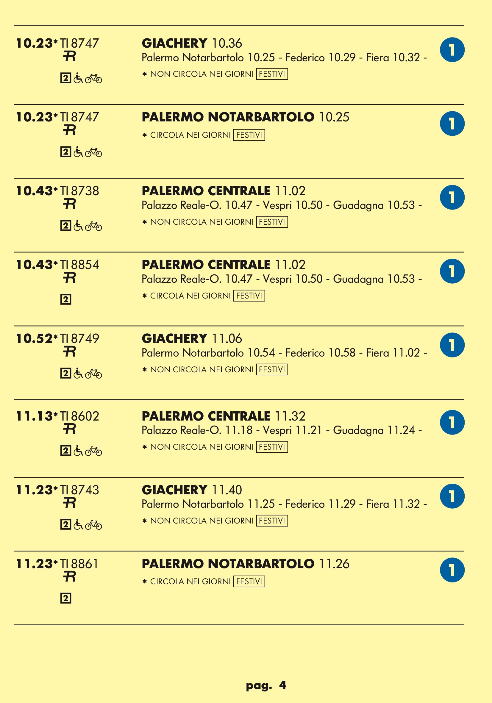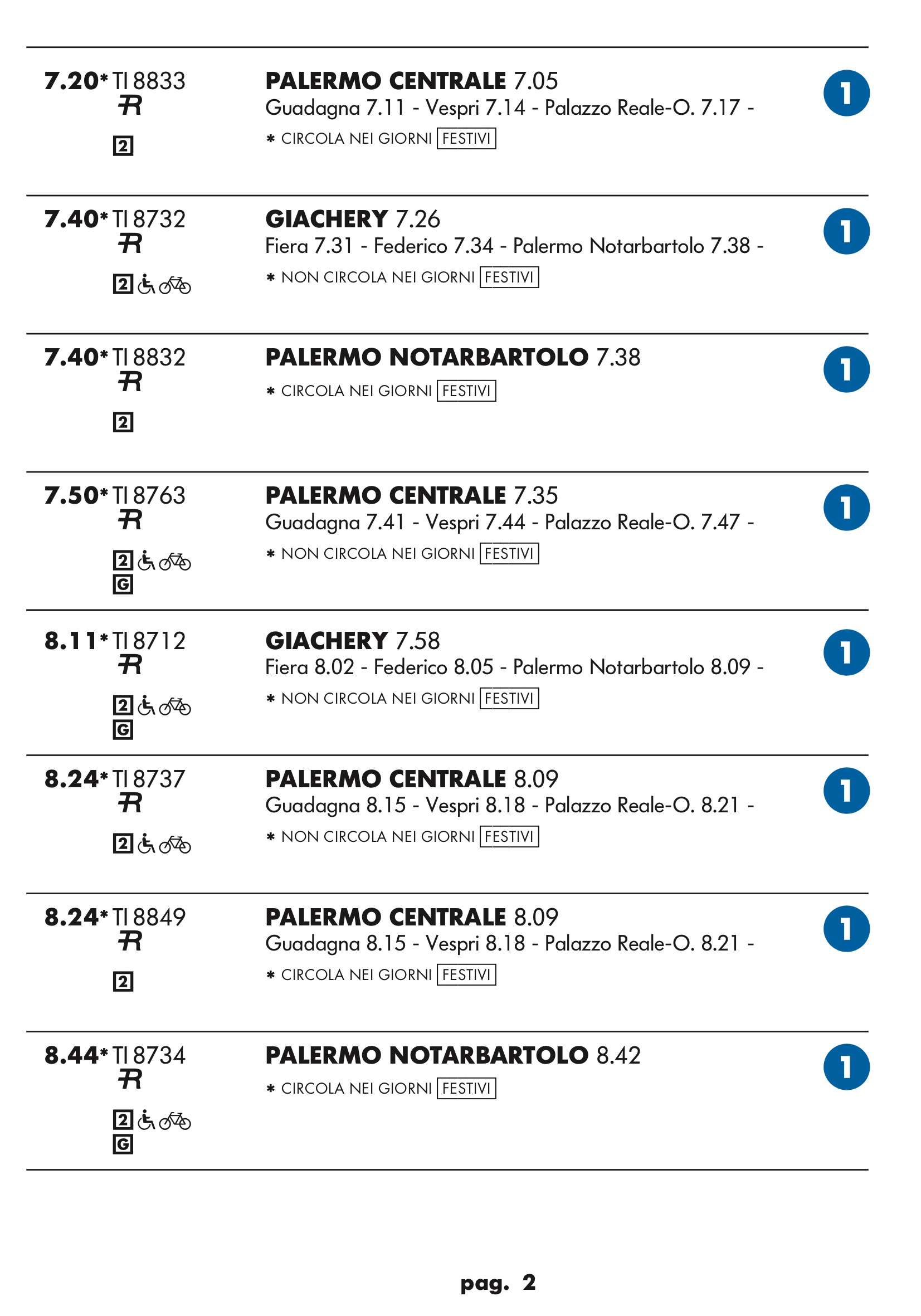 Come temevo in partenza dal binario 1 treno rapido per stazione notarbartolo.Dopo tanta attesa e disagi per i palermitani speravo in qualcosa a metà strada tra un treno ed una metropolitana.Un treno ogni mezz’ora è ridicolo.Vediamo se ora nell’anello dopo aver bloccato mezza città per anni ne faranno passare uno ogni tre quarti d’ora.