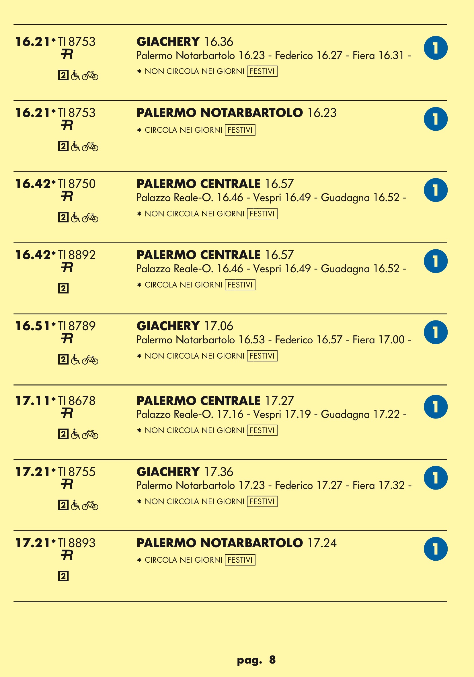 A chiarimento del mio precedente post: che l’opera sia incompleta è un dato di fatto, che vada giudicata nel 2018 idem, che il servizio Giachery/Centrale sia momentaneo e dovuto all’interruzione della linea in direzione Trapani lo sappiamo pure, ma che nel 2016, pur in condizioni particolari, si stili un orario ferroviario in cui ci si mettano 7 o 5 minuti per fare poche centinaia di metri fra una stazione e la successiva, peraltro su un tratto di linea non interessato da lavori, è fuori da ogni logica metropolitana.