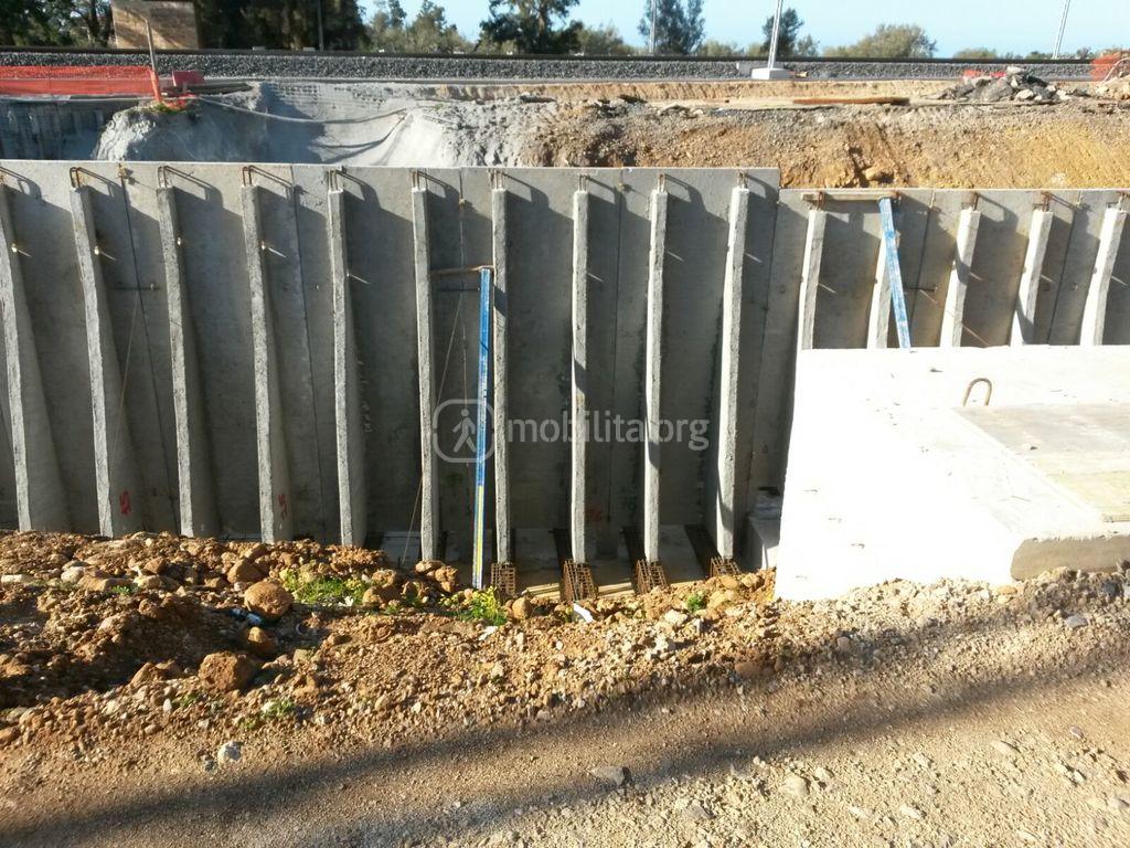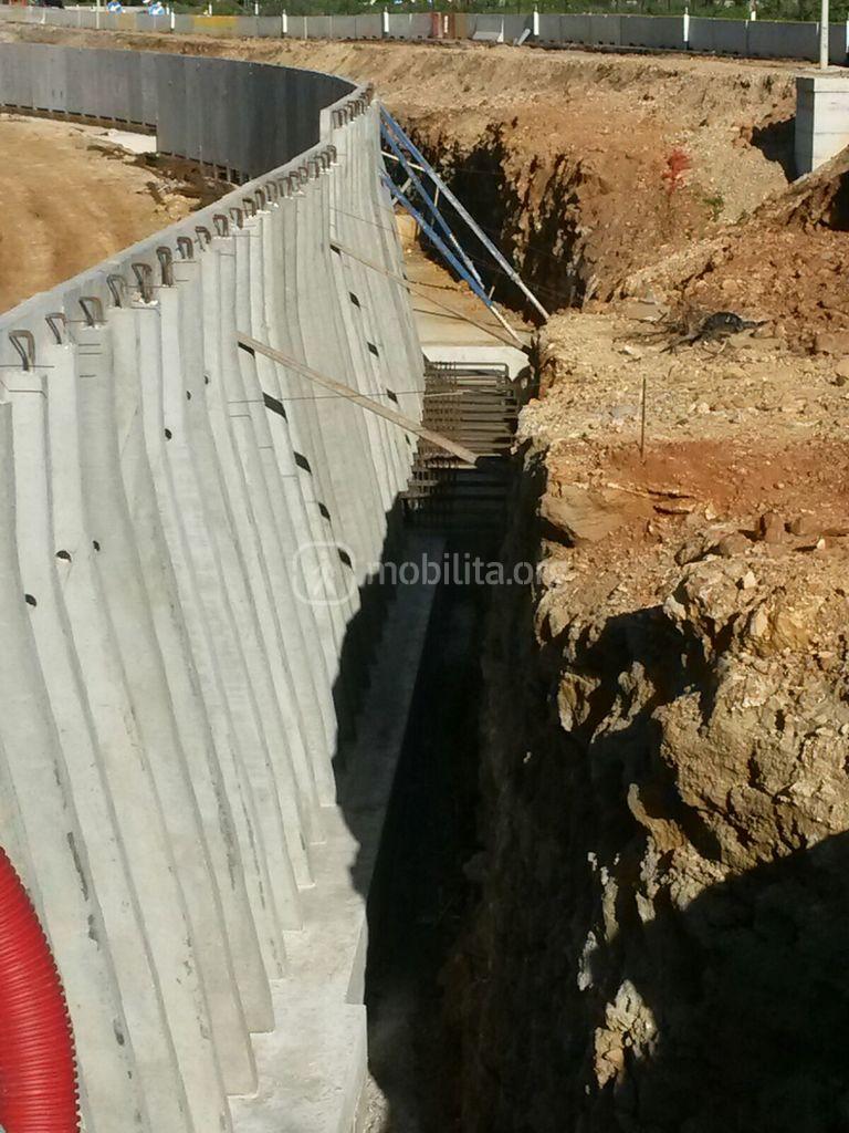 Sbloccato lo spostamento dei cavi di media tensione (MT) si è potuto procedere con i lavori che vi avevamo documentato qualche mese fa e procedere con l’avanzamento dei muri di sostegno delle rampe, realizzati in elementi in c.a.p. (cemento armato precompresso) incastrati alla base in robuste fondazioni