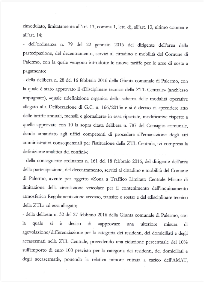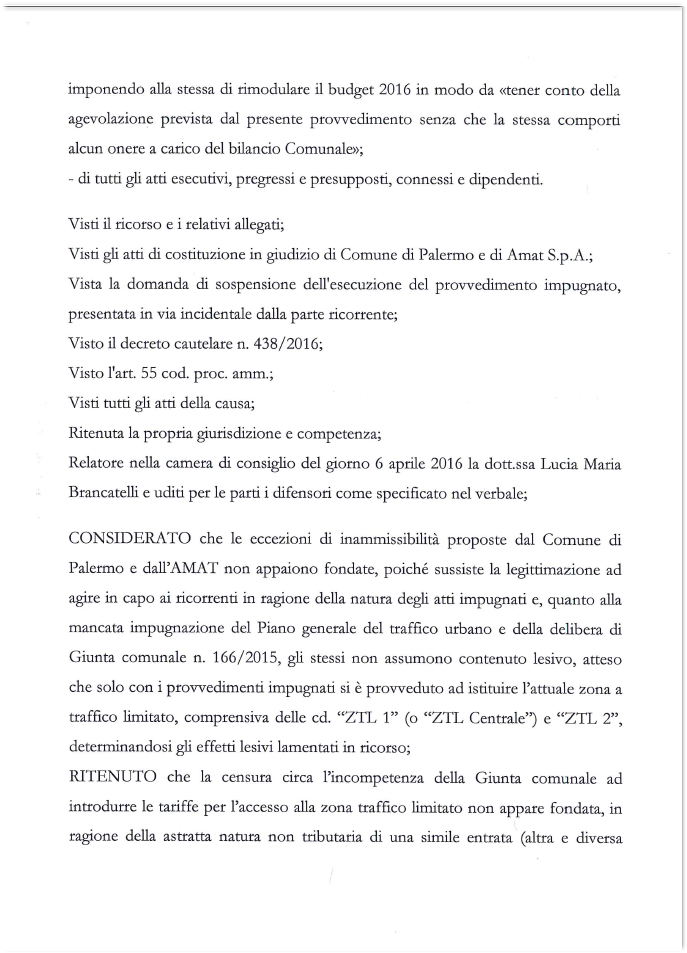 L’unica motivazione plausibile che il Tar, a norma di legge, avrebbe potuto fornire, è che Palermo non ha ancora i Pgtu, e che per attivare le Ztl deve prima elaborarli. Punto.