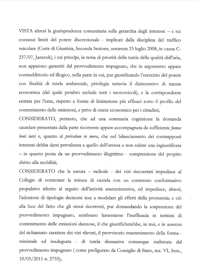 I giudici non sono del cacchio. Hanno fatto una cosa bellissima e giustissima. Leggo solo adesso l’ordinanza e sbattono in faccia palesemente al comune come manchi un piano decente di trasporto pubblico.