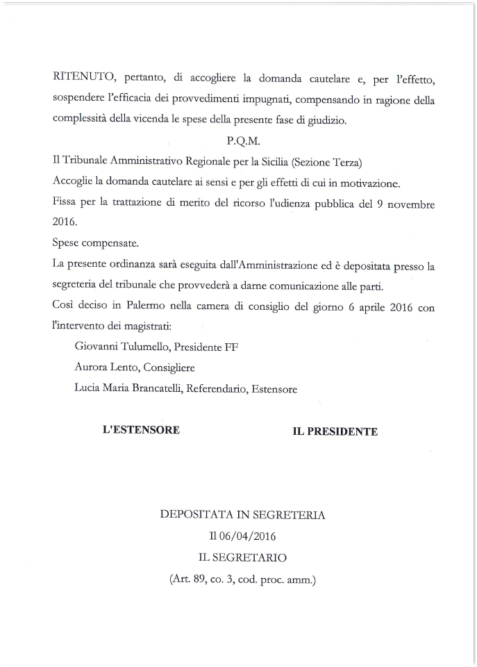 Sospeso non vuol dire accolto, vuol dire che in attesa della decisione il TAR ha ritenuto che l’esecuzione del provvedimento impugnato possa arrecare danno ai ricorrenti. Quando è stata fissata l’udienza per la decisione nel merito?