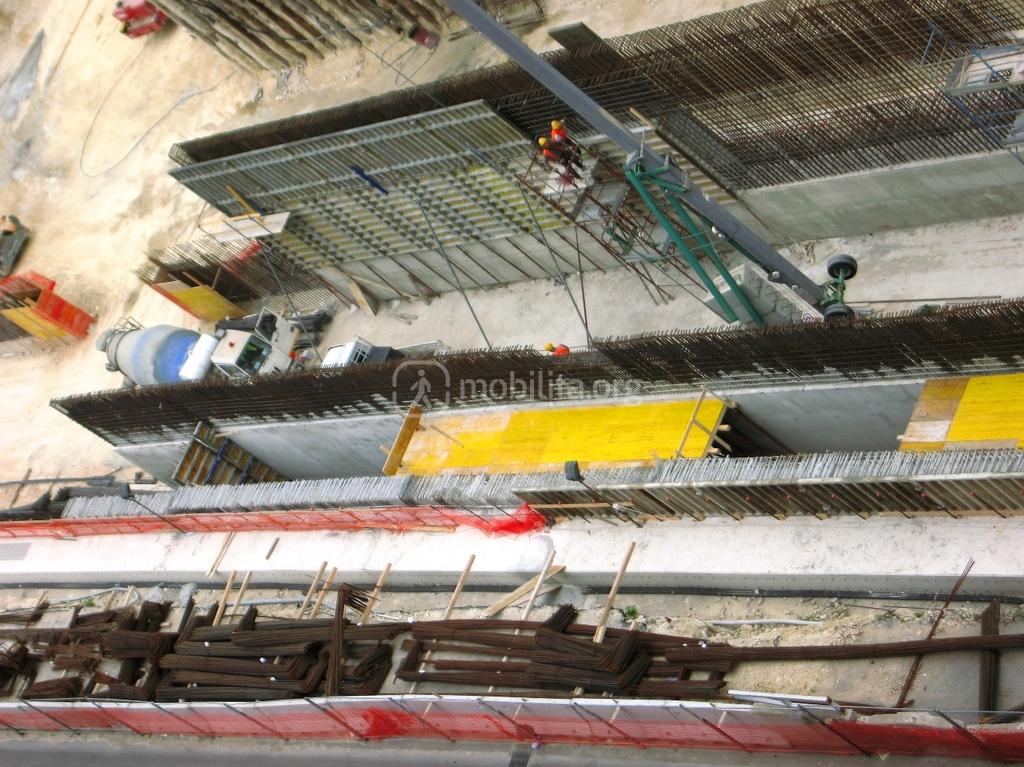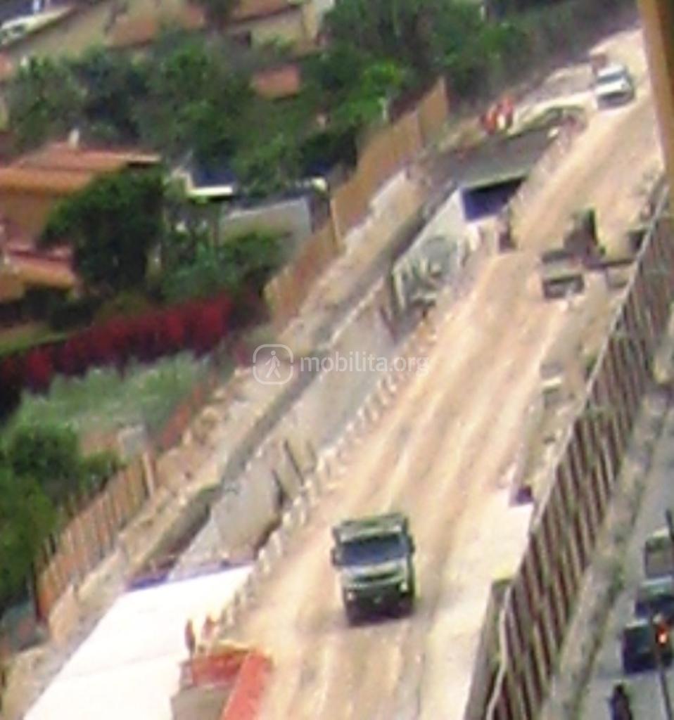 Più in là, verso la fermata Francia, si può osservare la modalità di esecuzione della copertura della galleria dispari, poco visibile da altre postazioni. Si nota che, da un certo punto in poi, i solettoni di superficie non sono disposti sullo stesso piano.