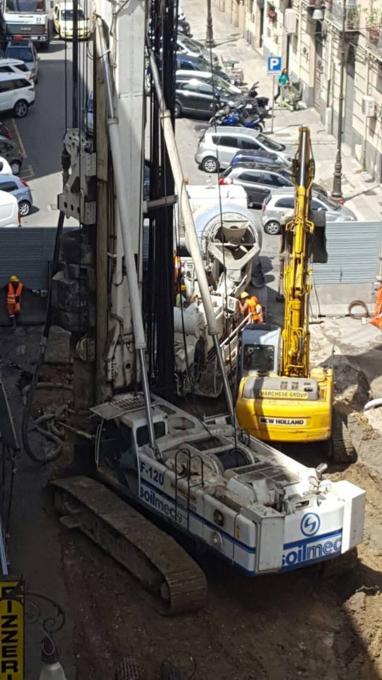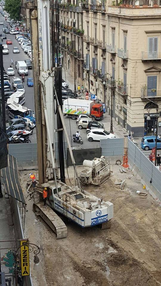 In Via Amari si sta procedendo alla realizzazione dei pali secanti che serviranno a sostenere il solettone, solettone che non appena verrà realizzato permetterà la riapertura della strada.
