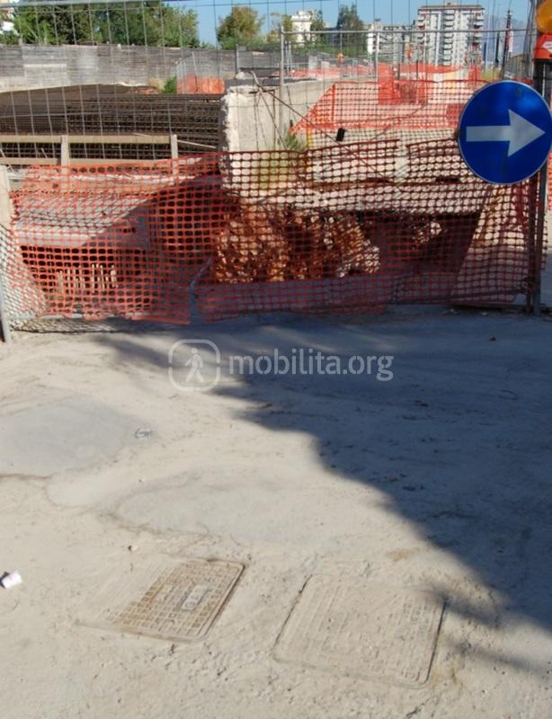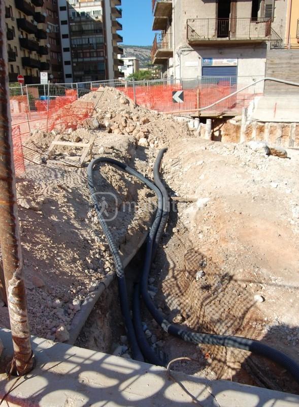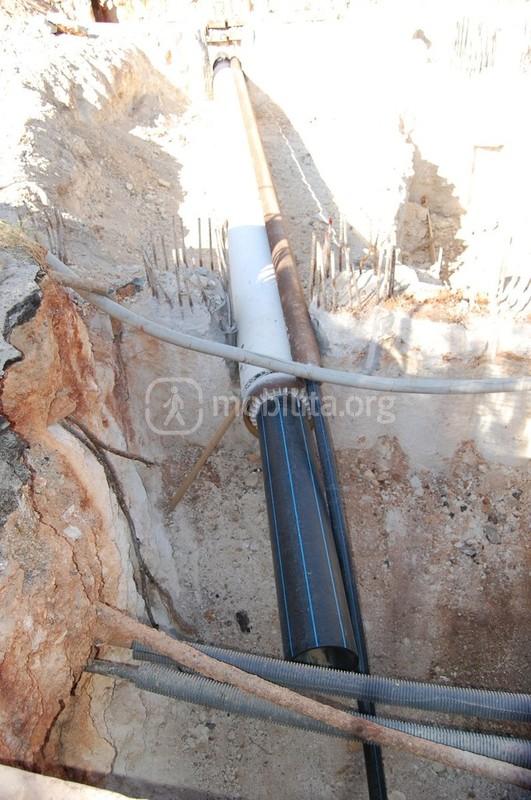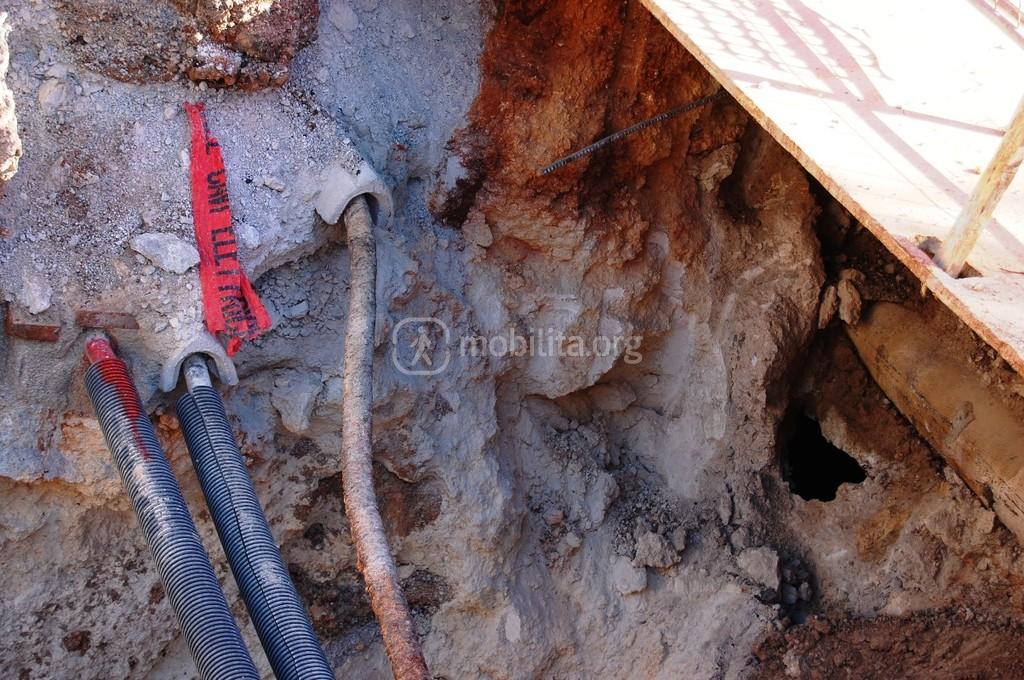 Come vediamo i sottoservizi non si limitano alla fognatura, già spostata e neanche a questi tubi acquedottistica; si osserva la presenza di cavi della media tensione, un’altra tubazione idrica e persino il gas (tubo grande semisepolto sulla destra)