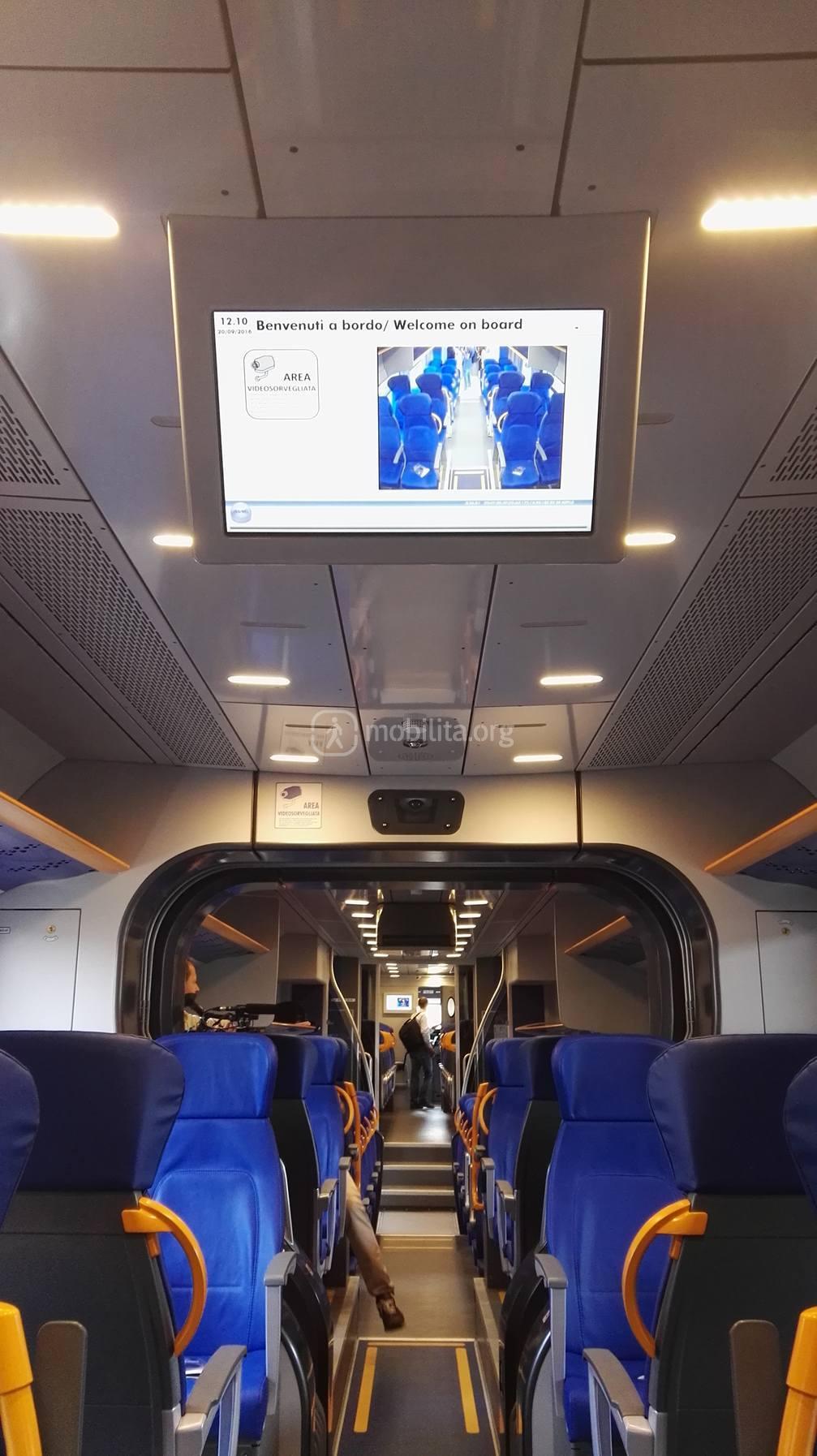 Molti i servizi a bordo: impianto di videosorveglianza, schermi luminosi interni visibili da ogni punto del treno per le informazioni, impianto di sonorizzazione, scritte in braille, prese di corrente a 220 V per l’alimentazione di cellulari e PC portatili.