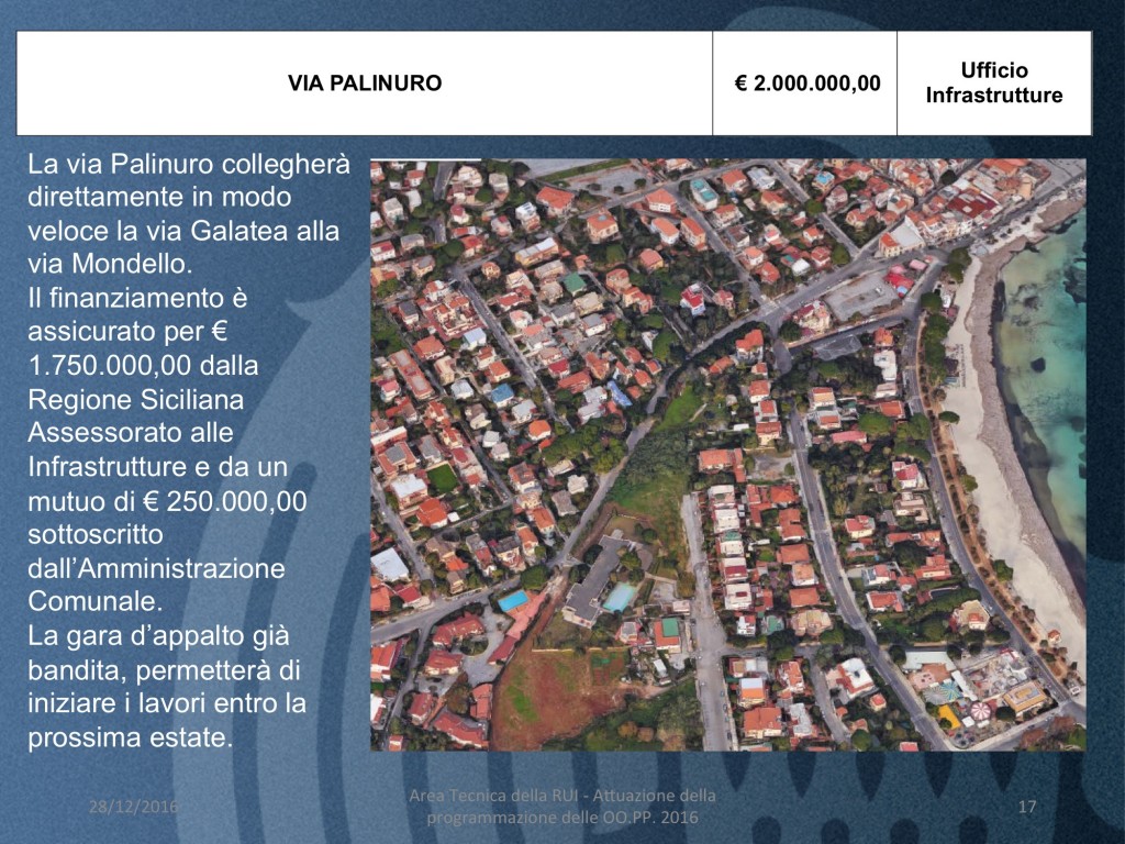 Tra le opere più importanti – ricorda Arcuri – la rete fognaria in via Messina Marine, dal fiume Oreto a piazza Sperone dove sono stati realizzati due collettori che raccolgono le acque piovane e gli scarichi fognari e che consente di giungere al risanamento delle acque della costa sud, il restauro del Palazzo di Città, i lavori di restauro e di recupero di Villa Giulia, l’ampliamento della rete fognaria nelle vie Mango e Atanasio e il rifacimento degli impianti semaforici. Nei primi giorni del 2017 è previsto l’avvio dei lavori di manutenzione straordinaria, di adeguamento alle norme igienico-sanitarie e degli impianti elettrici e antincendio di sei asili nido. Nell’elenco troviamo anche il completamento delle aule della scuola elementare “Cavallari”, oltre alla manutenzione straordinaria del canale di Boccadifalco e delle caditoie, Previsti anche i lavori di ristrutturazione dell’asilo Nino Drago e la riqualificazione delle palestre degli edifici scolastici “Leonardo da Vinci, “Scipione di Castro” e “Salerno”.