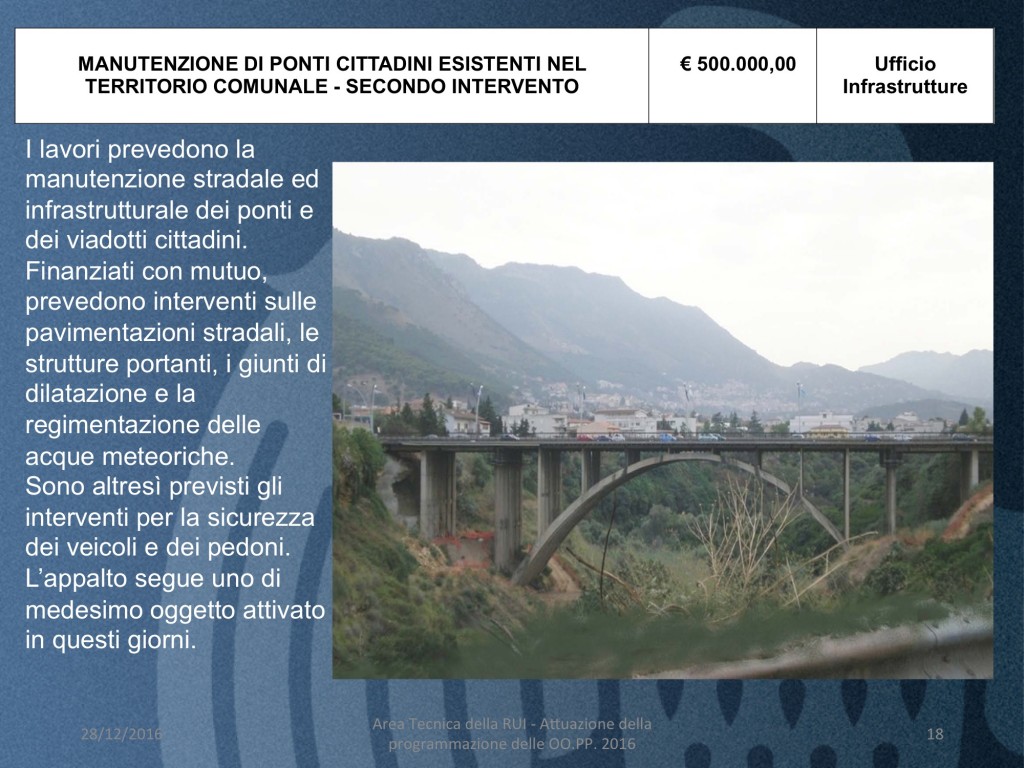 - MANUTENZIONE DI PONTI CITTADINI ESISTENTI NEL TERRITORIO COMUNALE – SECONDO INTERVENTO (costo 500 mila euro)