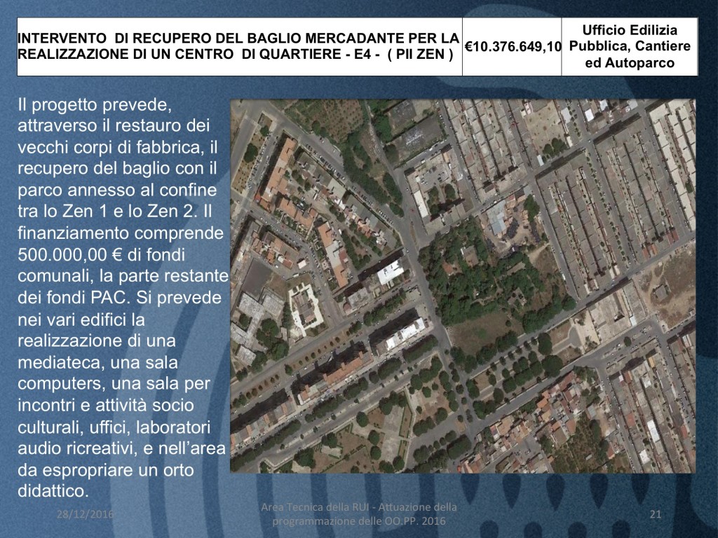 - INTERVENTO DI RECUPERO DEL BAGLIO MERCADANTE PER LA REALIZZAZIONE DI UN CENTRO DI QUARTIERE – E4 – ( PII ZEN ) (costo 10.377 mila euro)