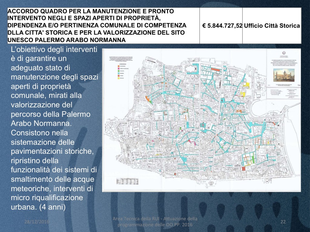 - ACCORDO QUADRO PER LA MANUTENZIONE E PRONTO INTERVENTO NEGLI E SPAZI APERTI DI PROPRIETÀ, DIPENDENZA E/O PERTINENZA COMUNALE DI COMPETENZA DLLA CITTA’ STORICA E PER LA VALORIZZAZIONE DEL SITO UNESCO PALERMO ARABO NORMANNA (costo 5 milioni e 845 mila euro)