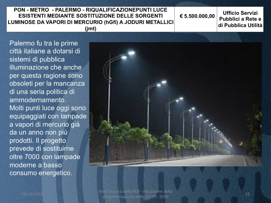 - PON – METRO – PALERMO – RIQUALIFICAZIONEPUNTI LUCE ESISTENTI MEDIANTE SOSTITUZIONE DELLE SORGENTI LUMINOSE DA VAPORI DI MERCURIO (hGfi) A JODURI METALLICI (costo 5 milioni e 500 mila euro)