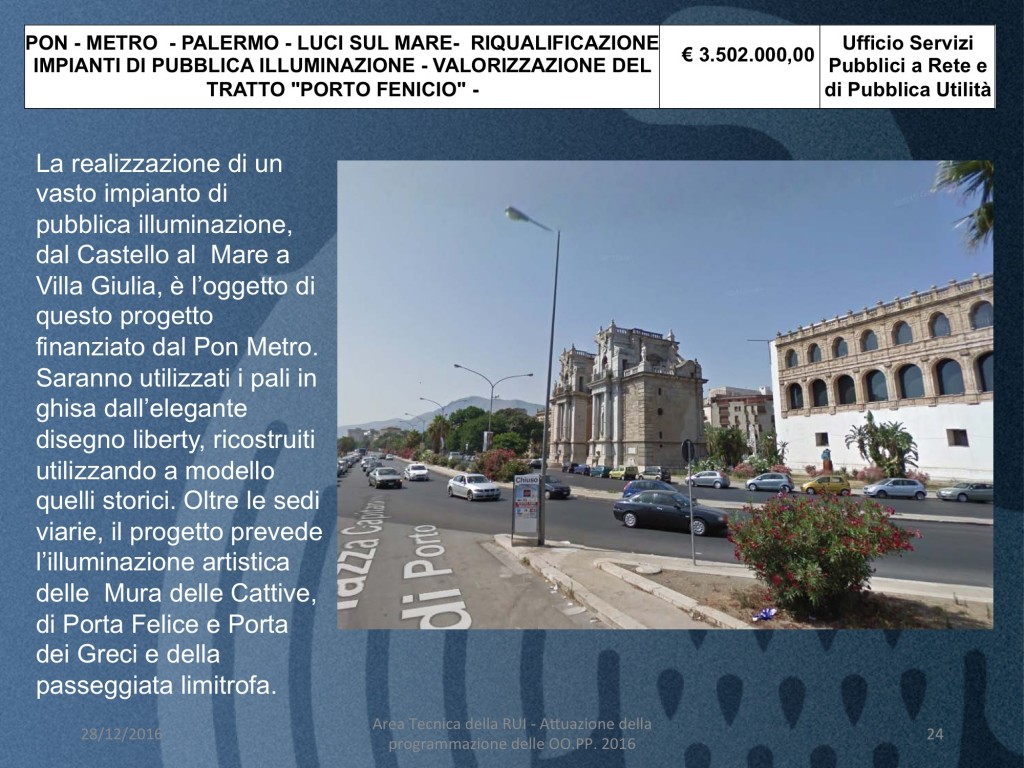 - PON – METRO – PALERMO – LUCI SUL MARE- RIQUALIFICAZIONE IMPIANTI DI PUBBLICA ILLUMINAZIONE – VALORIZZAZIONE DEL TRATTO “PORTO FENICIO” (costo 3 milioni e 502 mila euro) La realizzazione di un vasto impianto di pubblica illuminazione, dal Castello al Mare a Villa Giulia, è l’oggetto di questo progetto finanziato dal Pon Metro. Saranno utilizzati i pali in ghisa dall’elegante disegno liberty, ricostruiti utilizzando a modello quelli storici. Oltre le sedi viarie, il progetto prevede l’illuminazione artistica delle Mura delle Cattive, di Porta Felice e Porta dei Greci e della passeggiata limitrofa.