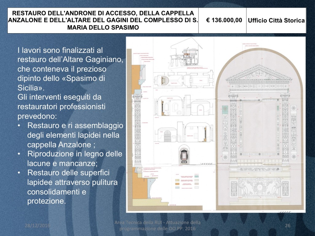 - RESTAURO DELL’ANDRONE DI ACCESSO, DELLA CAPPELLA ANZALONE E DELL’ALTARE DEL GAGINI DEL COMPLESSO DI S. MARIA DELLO SPASIMO (costo 136 mila euro)