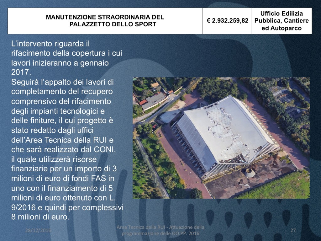 - MANUTENZIONE STRAORDINARIA DEL PALAZZETTO DELLO SPORT (costo 2 milioni e 93e mila euro)
