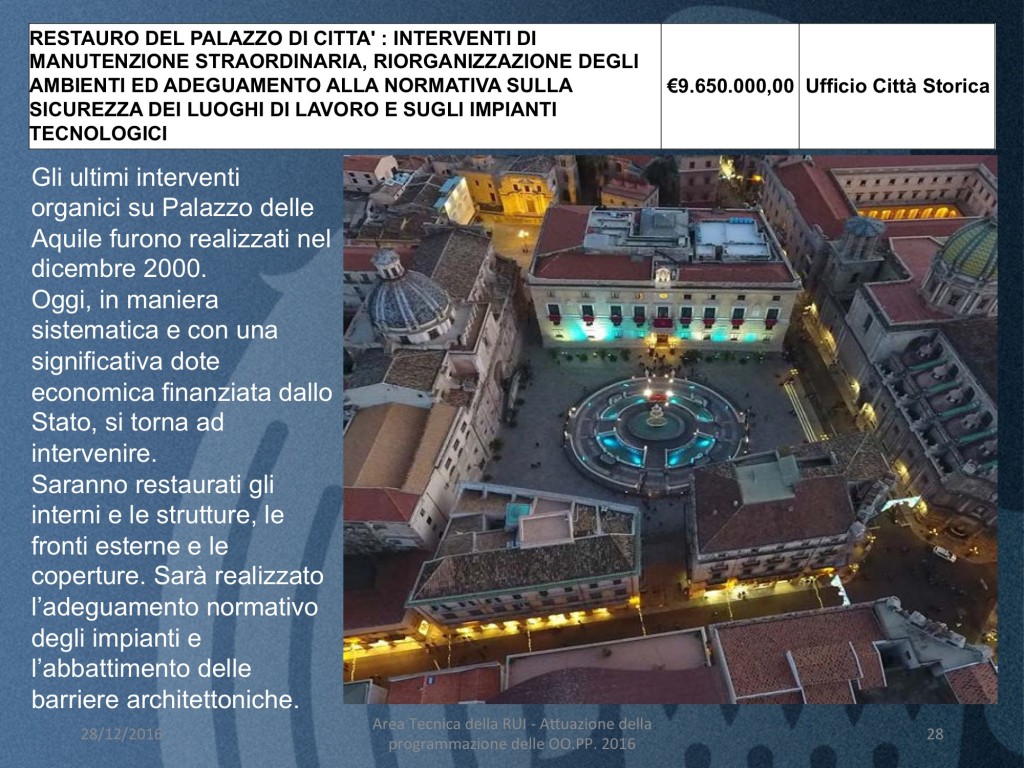 -RESTAURO DEL PALAZZO DI CITTA’ : INTERVENTI DI MANUTENZIONE STRAORDINARIA, RIORGANIZZAZIONE DEGLI AMBIENTI ED ADEGUAMENTO ALLA NORMATIVA SULLA SICUREZZA DEI LUOGHI DI LAVORO E SUGLI IMPIANTI TECNOLOGICI (costo 9 milioni e.650 mila euro)