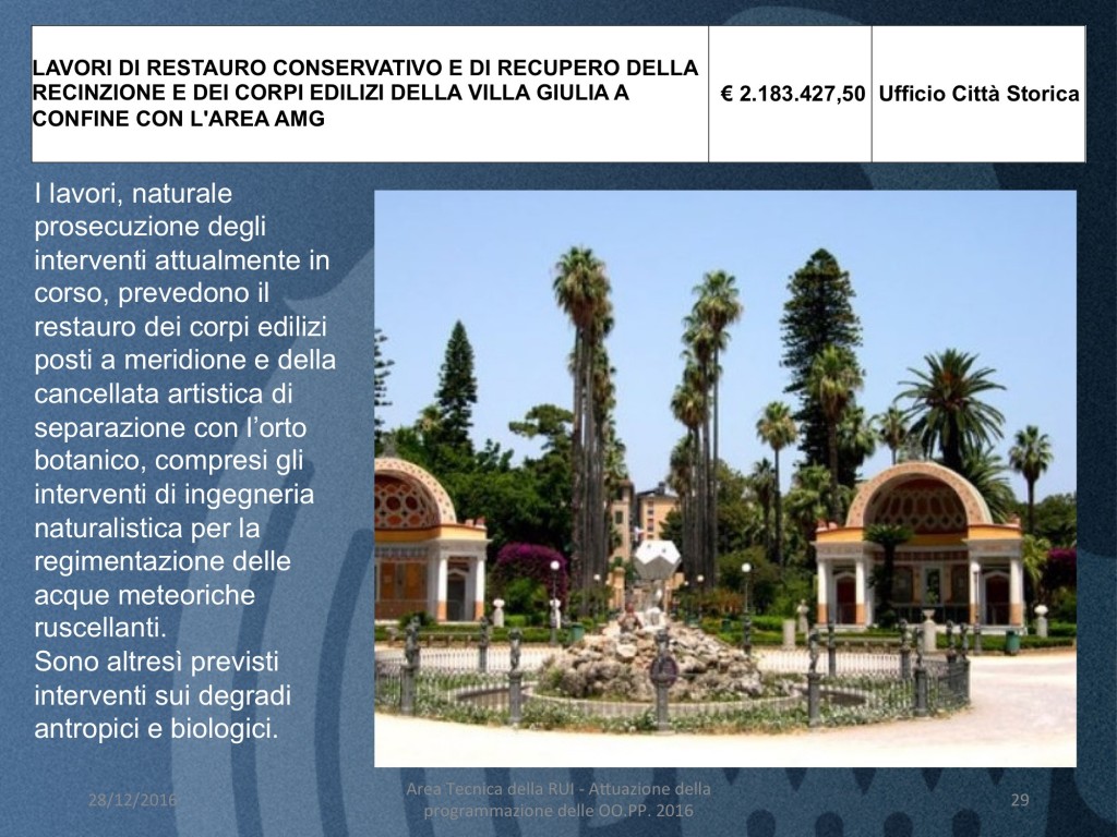 - LAVORI DI RESTAURO CONSERVATIVO E DI RECUPERO DELLA RECINZIONE E DEI CORPI EDILIZI DELLA VILLA GIULIA A CONFINE CON L’AREA AMG (costo 2 milioni e.184 euro) I lavori, naturale prosecuzione degli interventi attualmente in corso, prevedono il restauro dei corpi edilizi posti a meridione e della cancellata artistica di separazione con l’orto botanico, compresi gli interventi di ingegneria naturalistica per la regimentazione delle acque meteoriche ruscellanti. Sono altresì previsti interventi sui degradi antropici e biologici.