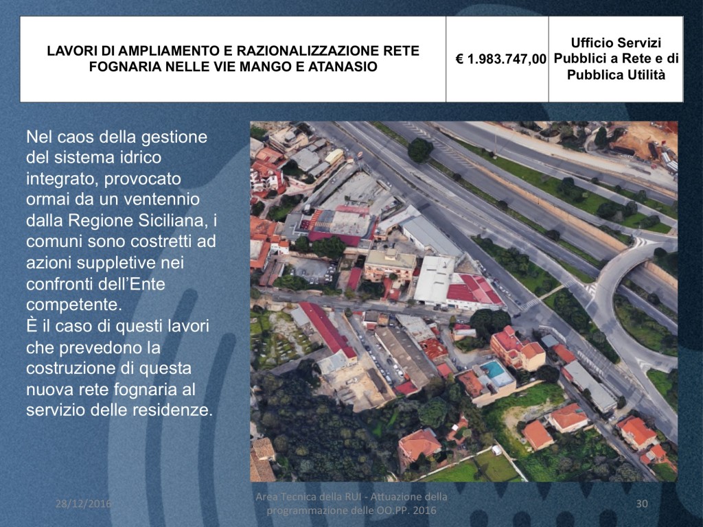 - LAVORI DI AMPLIAMENTO E RAZIONALIZZAZIONE RETE FOGNARIA NELLE VIE MANGO E ATANASIO (costo 1 milione e.984 mila euro) Nel caos della gestione del sistema idrico integrato, provocato ormai da un ventennio dalla Regione Siciliana, i comuni sono costretti ad azioni suppletive nei confronti dell’Ente competente. È il caso di questi lavori che prevedono la costruzione di questa nuova rete fognaria al servizio delle residenze.