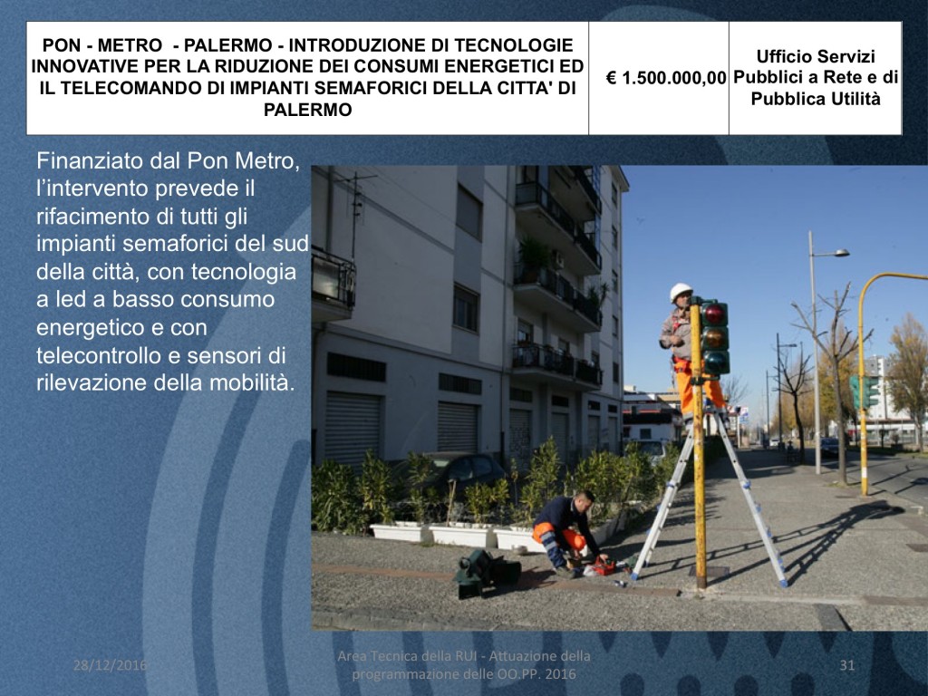 - PON – METRO – PALERMO – INTRODUZIONE DI TECNOLOGIE INNOVATIVE PER LA RIDUZIONE DEI CONSUMI ENERGETICI ED IL TELECOMANDO DI IMPIANTI SEMAFORICI DELLA CITTA’ DI PALERMO (costo 1 milione e.500 mila euro) Finanziato dal Pon Metro, l’intervento prevede il rifacimento di tutti gli impianti semaforici del sud della città, con tecnologia a led a basso consumo energetico e con telecontrollo e sensori di rilevazione della mobilità.