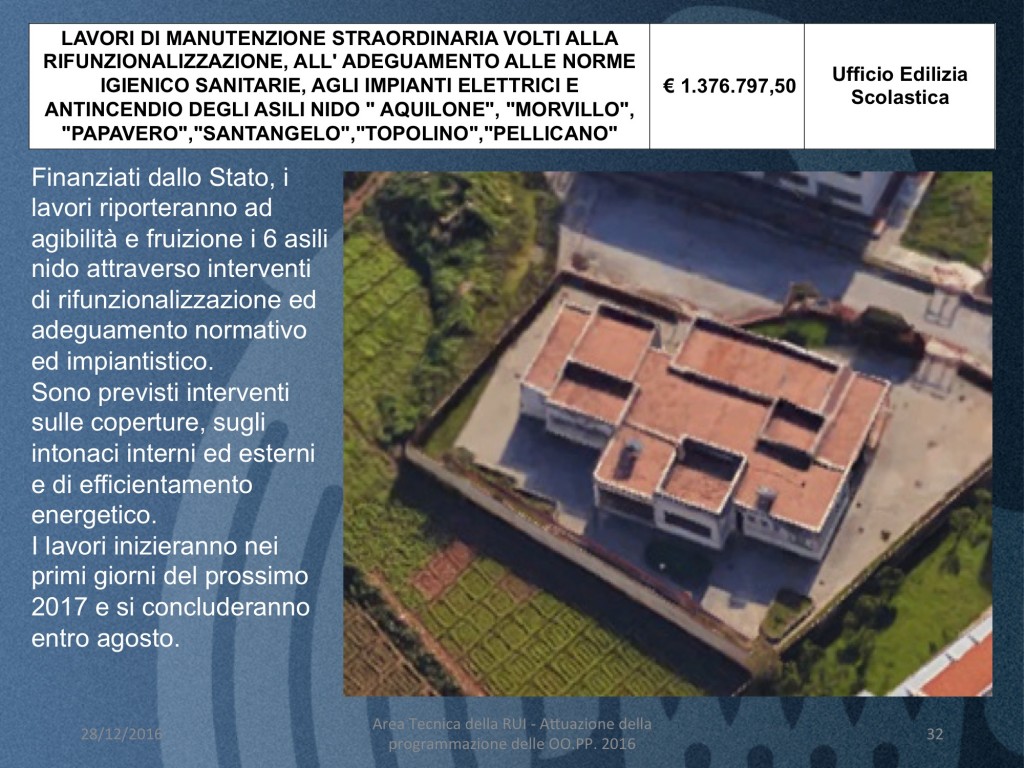 - LAVORI DI MANUTENZIONE STRAORDINARIA VOLTI ALLA IFUNZIONALIZZAZIONE, ALL’ ADEGUAMENTO ALLE NORME IGIENICO SANITARIE, AGLI IMPIANTI ELETTRICI E ANTINCENDIO DEGLI ASILI NIDO ” AQUILONE”, “MORVILLO”, “PAPAVERO”,”SANTANGELO”,”TOPOLINO”,”PELLICANO” (costo 1 milione e.377 mila euro)