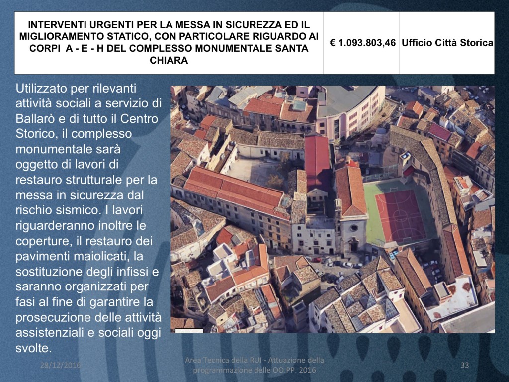 - INTERVENTI URGENTI PER LA MESSA IN SICUREZZA ED IL MIGLIORAMENTO STATICO, CON PARTICOLARE RIGUARDO AI CORPI A – E – H DEL COMPLESSO MONUMENTALE SANTA CHIARA (costo 1 milione e 93 mila euro)