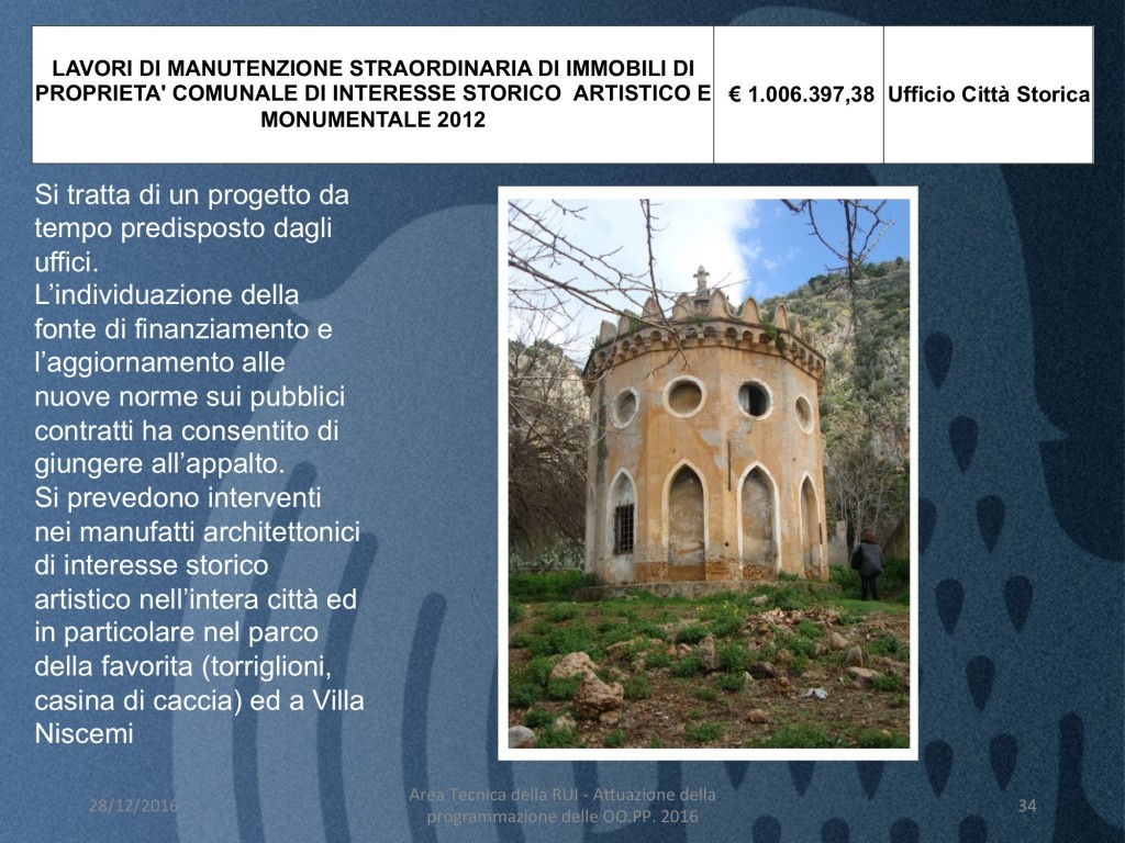 Si tratta di un progetto da tempo predisposto dagli uffici. L’individuazione della fonte di finanziamento e l’aggiornamento alle nuove norme sui pubblici contratti ha consentito di giungere all’appalto. Si prevedono interventi nei manufatti architettonici di interesse storico artistico nell’intera città ed in particolare nel parco della favorita (torriglioni, casina di caccia) ed a Villa Niscemi.