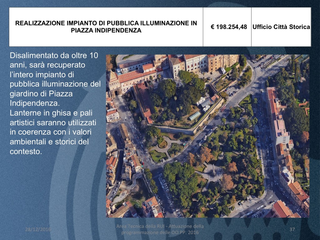 - REALIZZAZIONE IMPIANTO DI PUBBLICA ILLUMINAZIONE IN PIAZZA INDIPENDENZA (costo 198.255 mila euro)