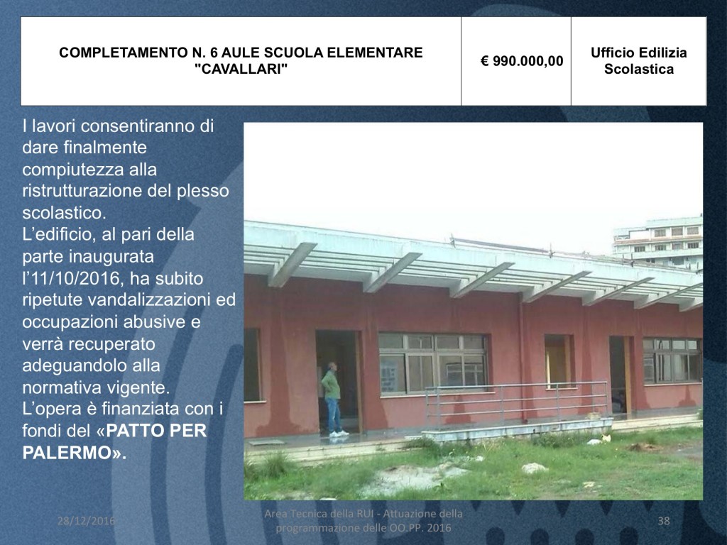 I lavori consentiranno di dare finalmente compiutezza alla ristrutturazione del plesso scolastico. L’edificio, al pari della parte inaugurata l’11/10/2016, ha subito ripetute vandalizzazioni ed occupazioni abusive e verrà recuperato adeguandolo alla normativa vigente. L’opera è finanziata con i fondi del «PATTO PER PALERMO».