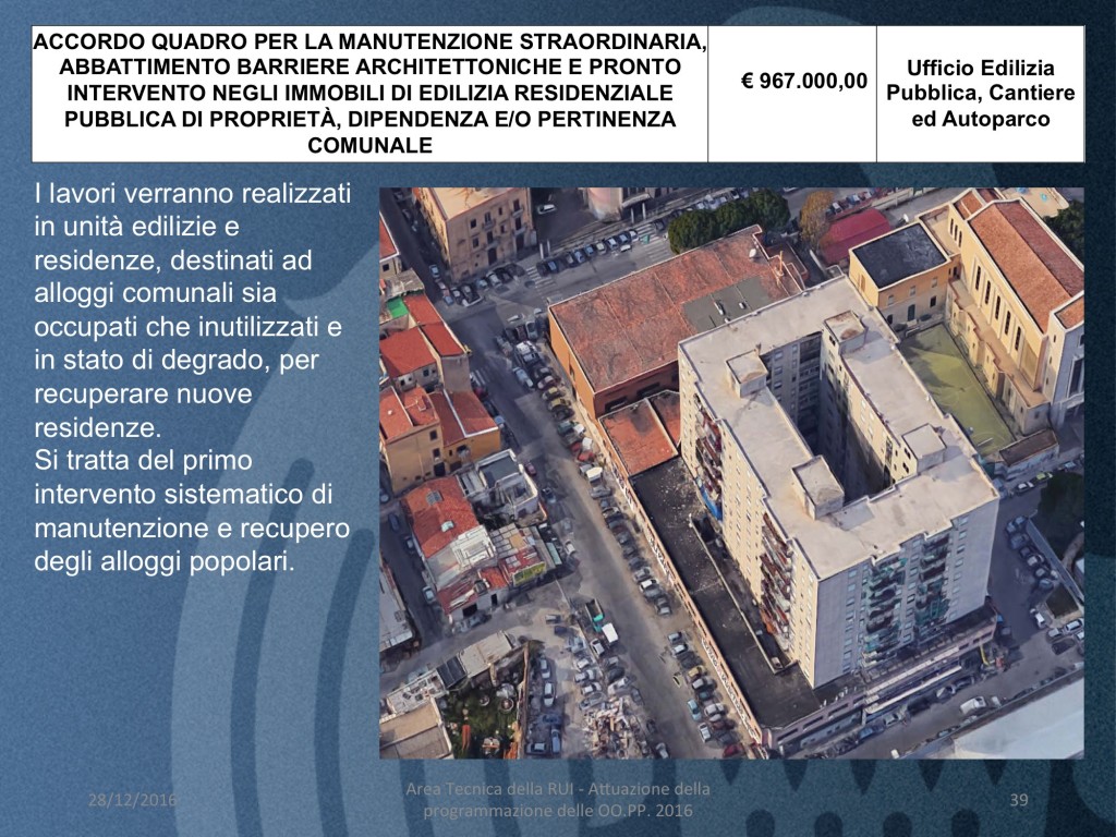 - ACCORDO QUADRO PER LA MANUTENZIONE STRAORDINARIA, ABBATTIMENTO BARRIERE ARCHITETTONICHE E PRONTO INTERVENTO NEGLI IMMOBILI DI EDILIZIA RESIDENZIALE PUBBLICA DI PROPRIETÀ, DIPENDENZA E/O PERTINENZA COMUNALE (costo 967 mila euro)