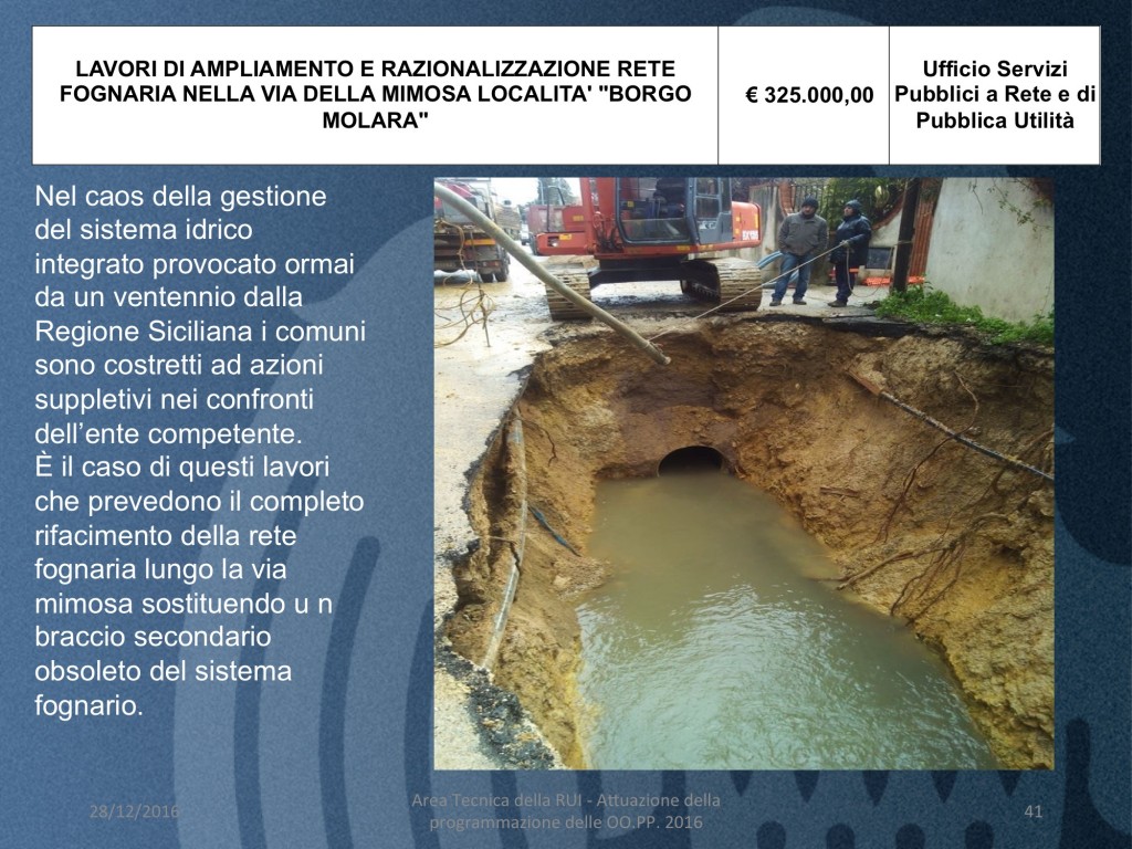 - LAVORI DI AMPLIAMENTO E RAZIONALIZZAZIONE RETE FOGNARIA NELLA VIA DELLA MIMOSA LOCALITA’ “BORGO MOLARA” (costo 325 mila euro)