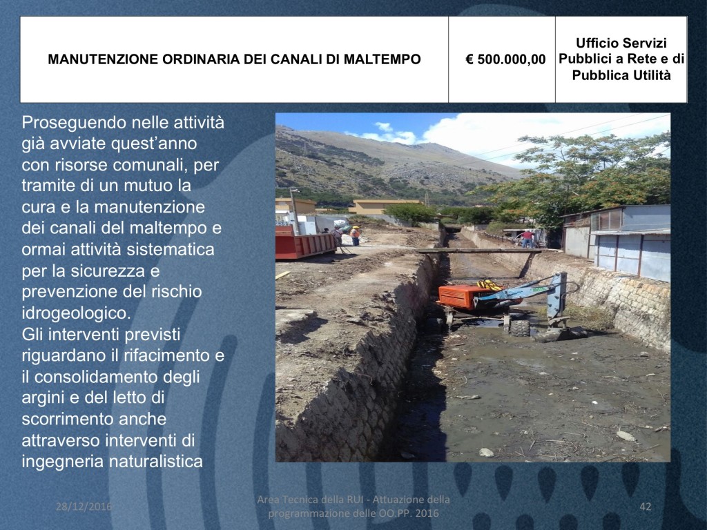 - MANUTENZIONE STRAORDINARIA DEL CANALE DI MALTEMPO – BOCCADIFALCO (costo 700 mila euro)