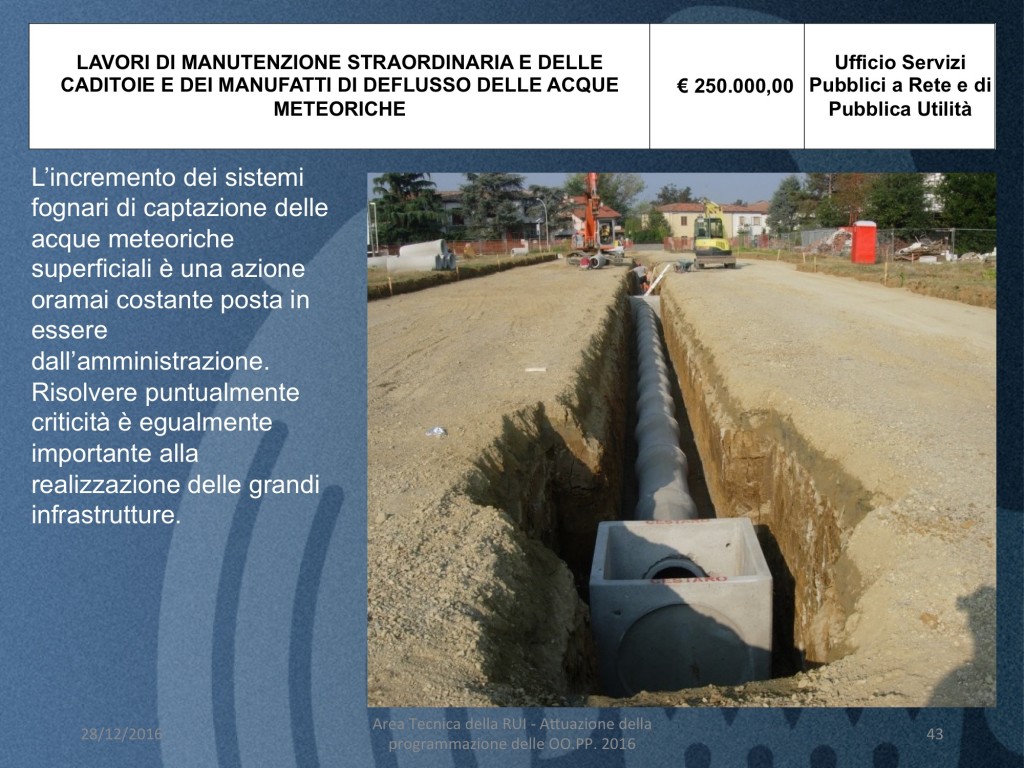 - LAVORI DI MANUTENZIONE STRAORDINARIA E DELLE CADITOIE E DEI MANUFATTI DI DEFLUSSO DELLE ACQUE METEORICHE (costo 250 mila euro)