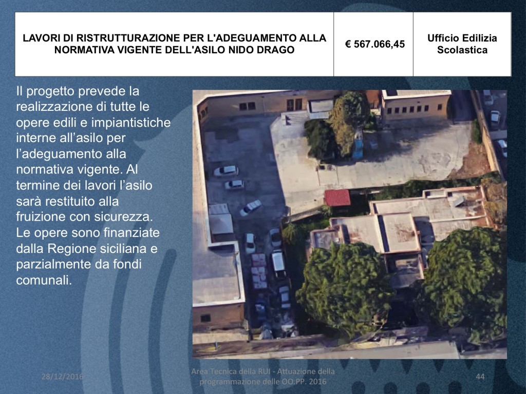 - LAVORI DI RISTRUTTURAZIONE PER L’ADEGUAMENTO ALLA NORMATIVA VIGENTE DELL’ASILO NIDO DRAGO (costo 567 mila euro)