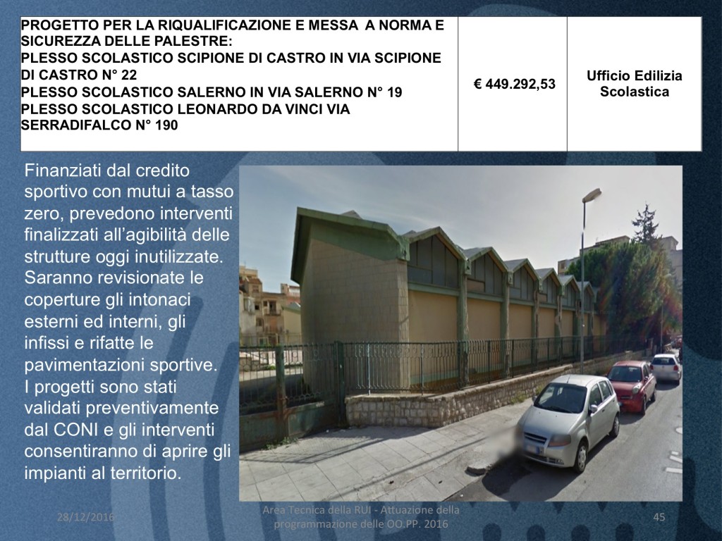 - PROGETTO PER LA RIQUALIFICAZIONE E MESSA A NORMA E SICUREZZA DELLE PALESTRE: PLESSO SCOLASTICO SCIPIONE DI CASTRO IN VIA SCIPIONE DI CASTRO N° 22 , PLESSO SCOLASTICO SALERNO IN VIA SALERNO N° 19. PLESSO SCOLASTICO LEONARDO DA VINCI VIA SERRADIFALCO N° 190 (costo 449.300 euro)