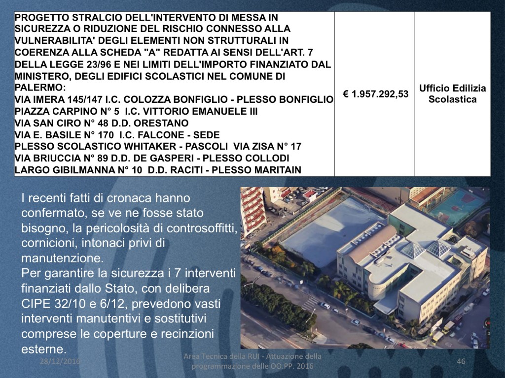 - PROGETTO STRALCIO DELL’INTERVENTO DI MESSA IN SICUREZZA O RIDUZIONE DEL RISCHIO CONNESSO ALLA VULNERABILITA’ DEGLI ELEMENTI NON STRUTTURALI IN COERENZA ALLA SCHEDA “A” REDATTA AI SENSI DELL’ART. 7 DELLA LEGGE 23/96 E NEI LIMITI DELL’IMPORTO FINANZIATO DAL MINISTERO, DEGLI EDIFICI SCOLASTICI NEL COMUNE DI PALERMO: VIA IMERA 145/147 I.C. COLOZZA BONFIGLIO – PLESSO BONFIGLIO PIAZZA CARPINO N° 5 I.C. VITTORIO EMANUELE III VIA SAN CIRO N° 48 D.D. ORESTANO VIA E. BASILE N° 170 I.C. FALCONE – SEDE PLESSO SCOLASTICO WHITAKER – PASCOLI VIA ZISA N° 17 VIA BRIUCCIA N° 89 D.D. DE GASPERI – PLESSO COLLODI LARGO GIBILMANNA N° 10 D.D. RACITI – PLESSO MARITAIN. (costo 1 milione e 957 mila euro)