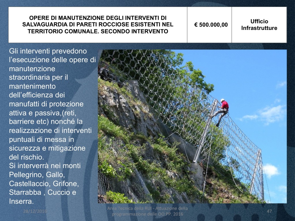 - OPERE DI MANUTENZIONE DEGLI INTERVENTI DI SALVAGUARDIA DI PARETI ROCCIOSE ESISTENTI NEL TERRITORIO COMUNALE. SECONDO INTERVENTO (costo 500 mila euro)