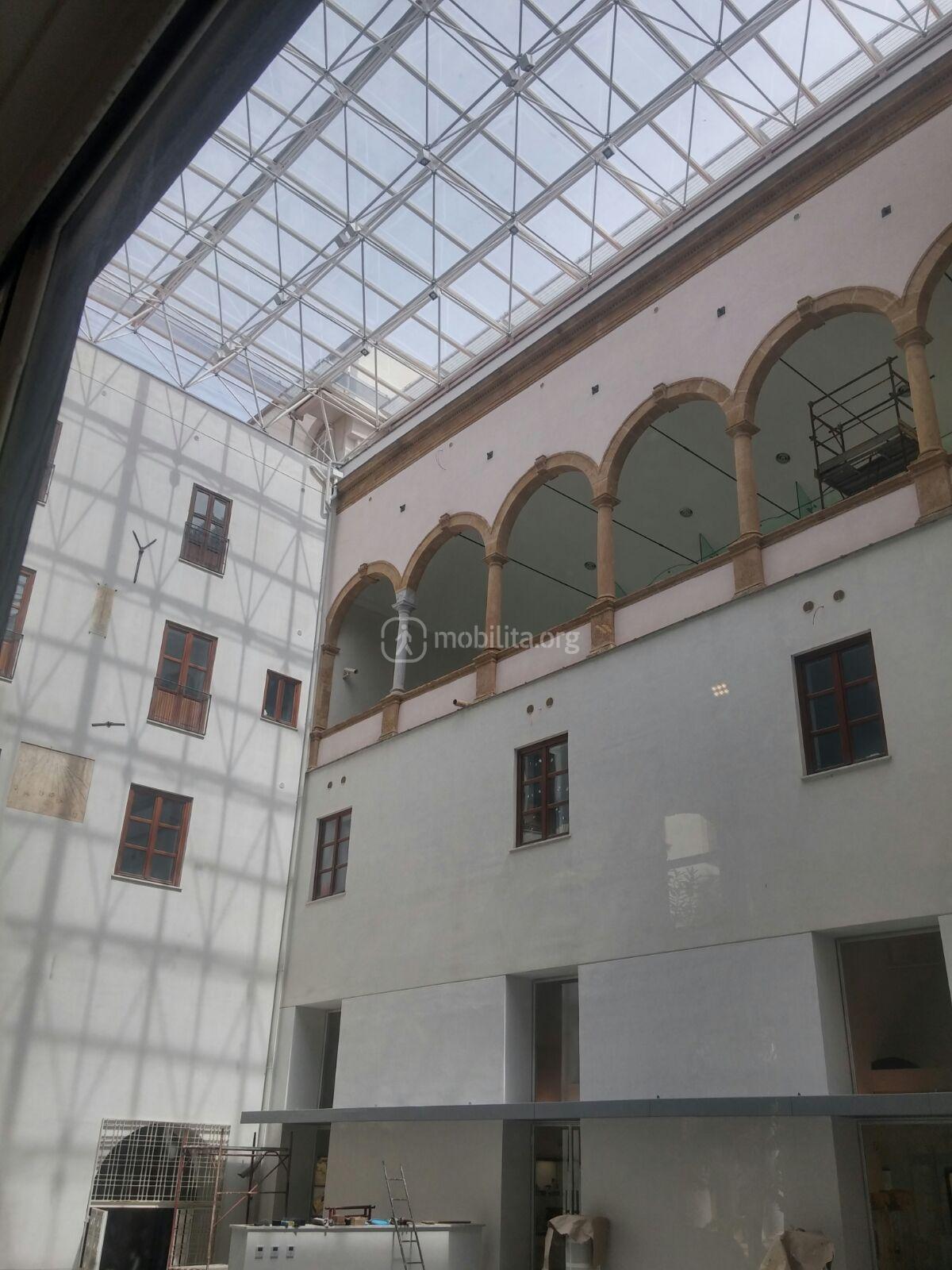 Sbirciando al piano terra, si scorge una piazza ancora chiusa al pubblico, con richiami alle origini greche di molte città siciliane.