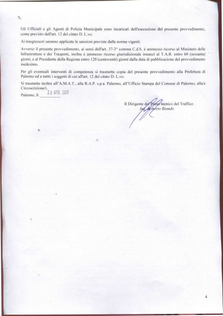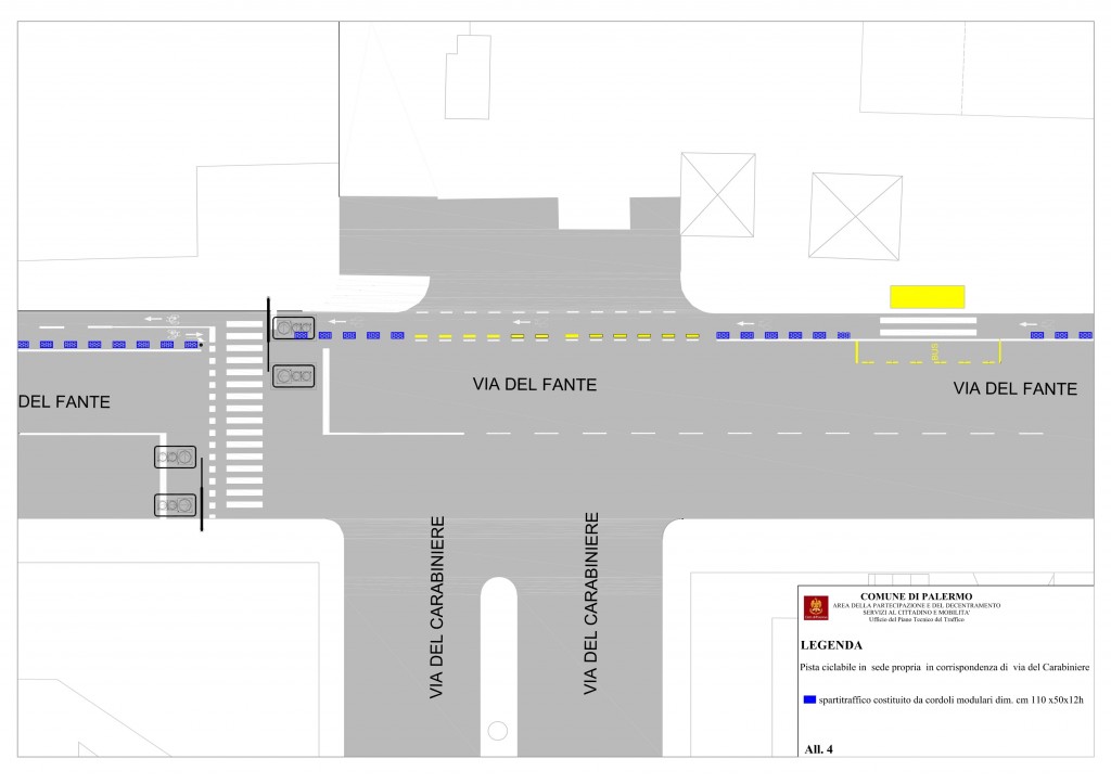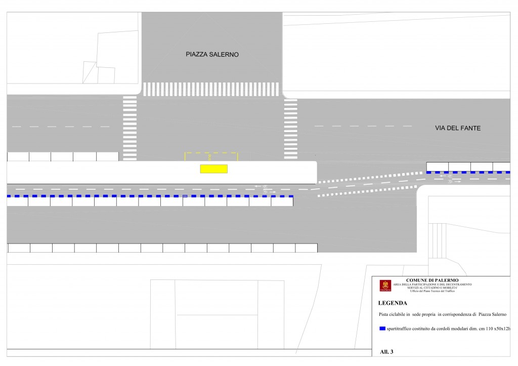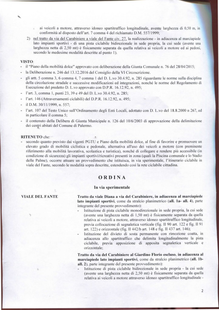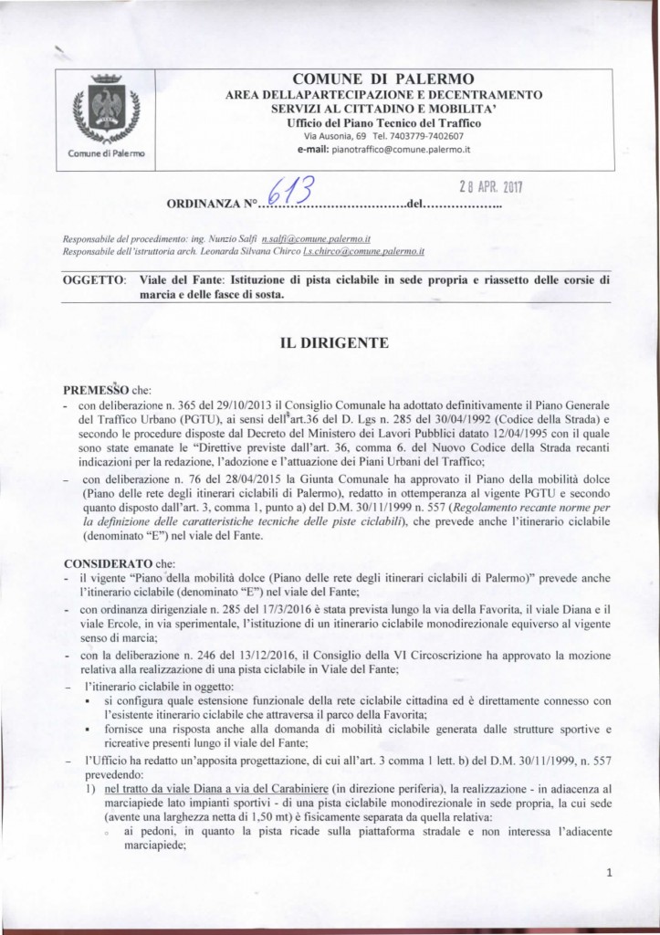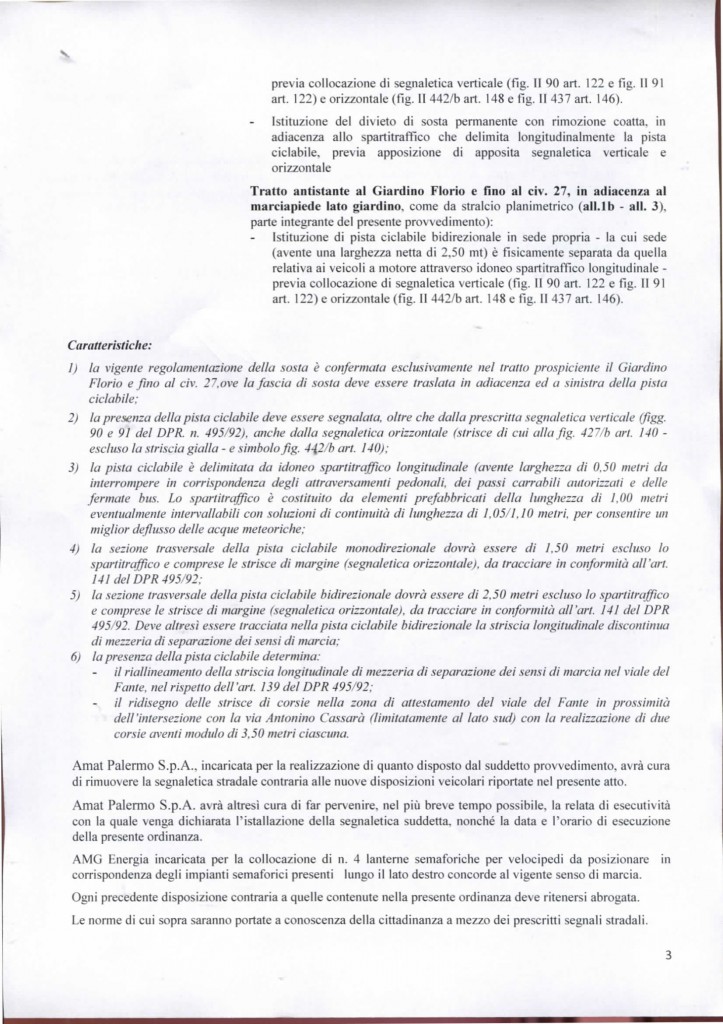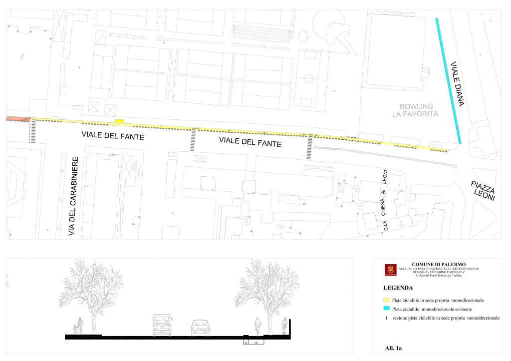 Con la delibera dell’ufficio traffico n° 613 del 28 Aprile 2017 viene autorizzata la realizzazione da parte di Amat della pista ciclabile in Viale Del Fante.