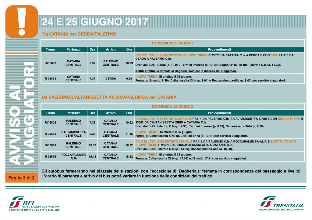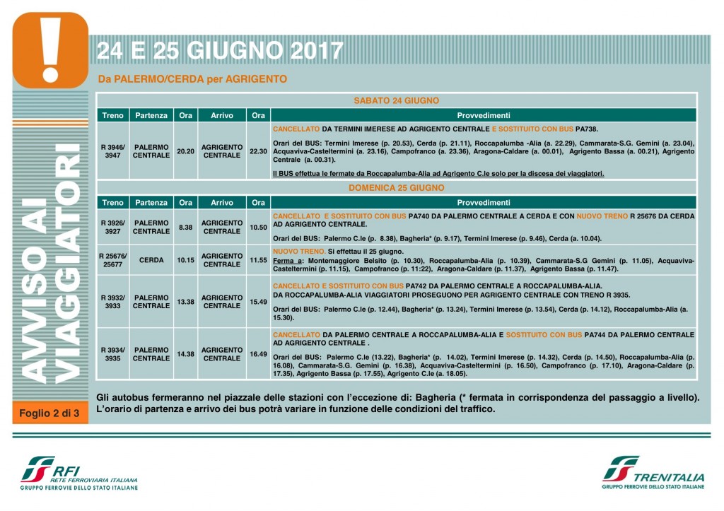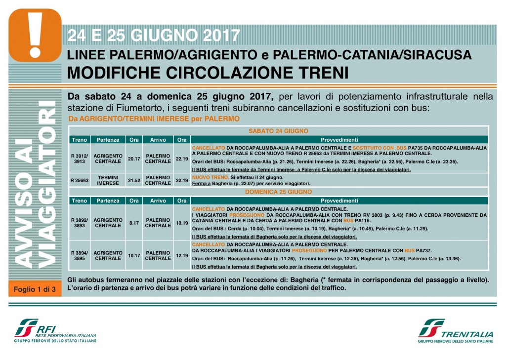Per consentire a Rete Ferroviaria Italiana di rendere operative le modifiche per il potenziamento infrastrutturale e tecnologico realizzate nella stazione di Fiumetorto e sul tratto di linea in direzione Campofelice di Roccella, sabato 24 e domenica 25 giugno sarà variato il programma di circolazione di alcuni treni regionali delle linee Palermo – Agrigento e Palermo – Catania – Siracusa.