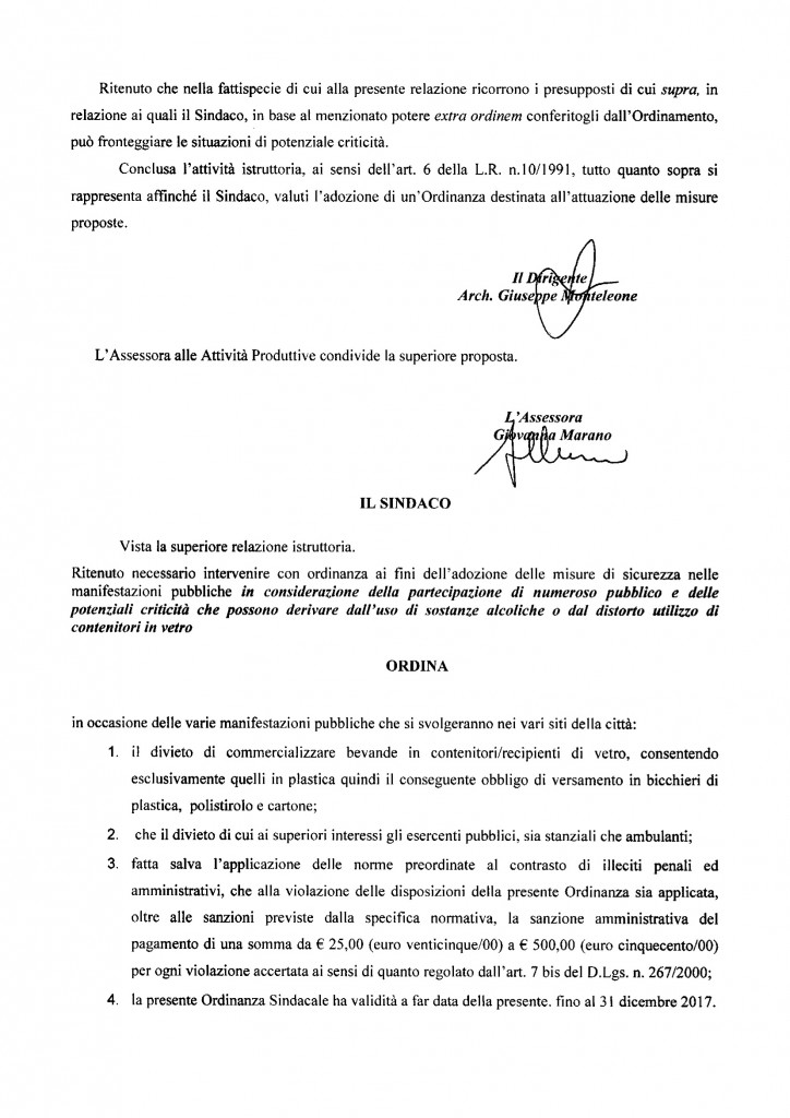E’ stata emanata l’ordinanza n. 136/2017 per l’adozione delle misure di sicurezza nelle manifestazioni pubbliche nei vari siti della città dalla data di emissione dell’ordinanza e fino al 31 dicembre 2017.